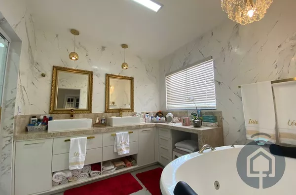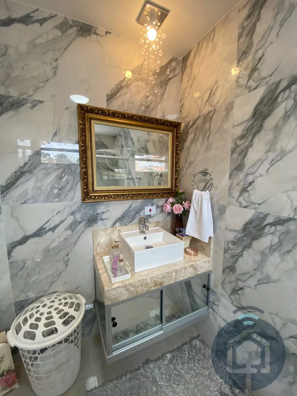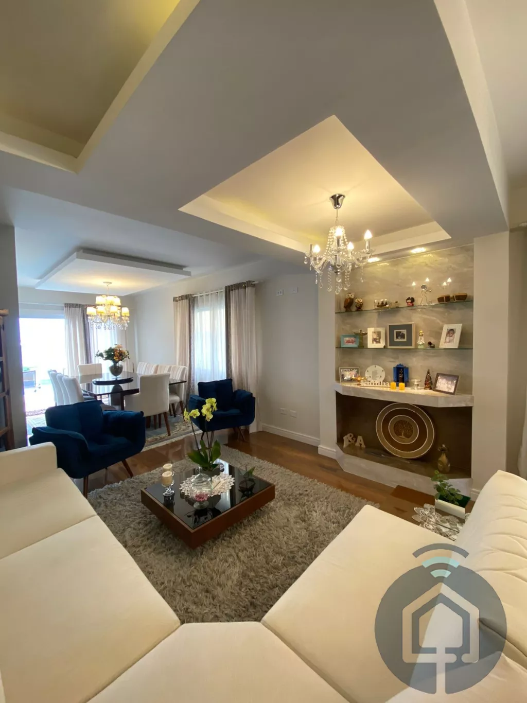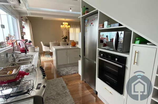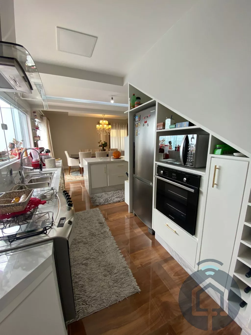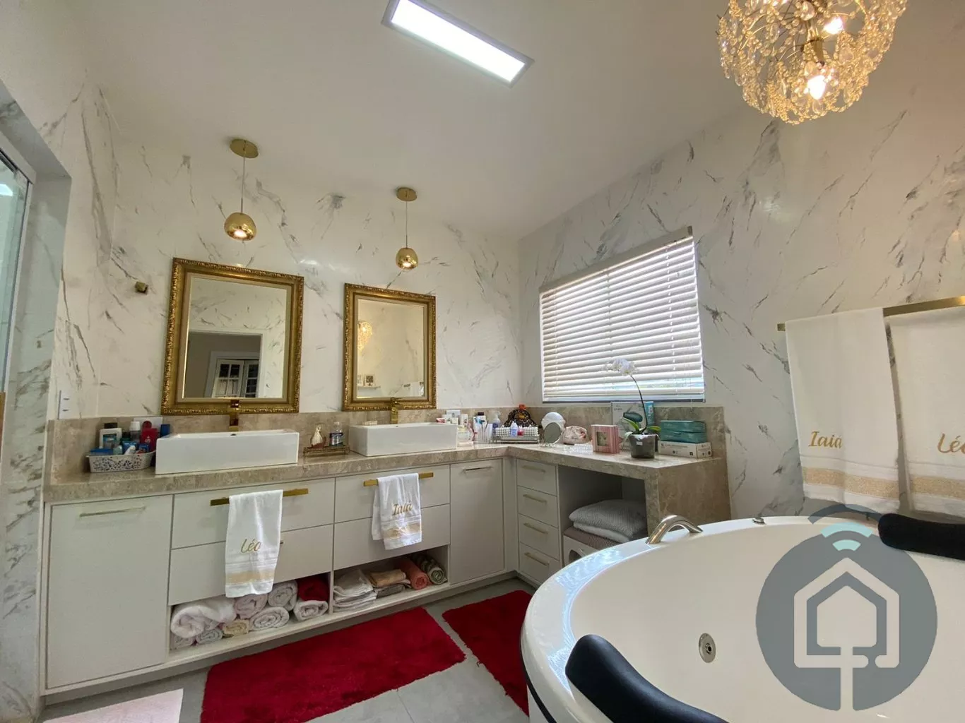 Está linda casa conta com amplo hall, living com lareira ecológica, lavabo, sala de jantar, cozinha planejada com forno elétrico, fogão, lava louças e despensa na piso inferior. O piso superior conta com uma suíte máster de 110 m² com lareira ecológica, closet, ampla varanda com fechamento em vidro, escritório, banheiro com duas cubas e banheira de hidromassagem.