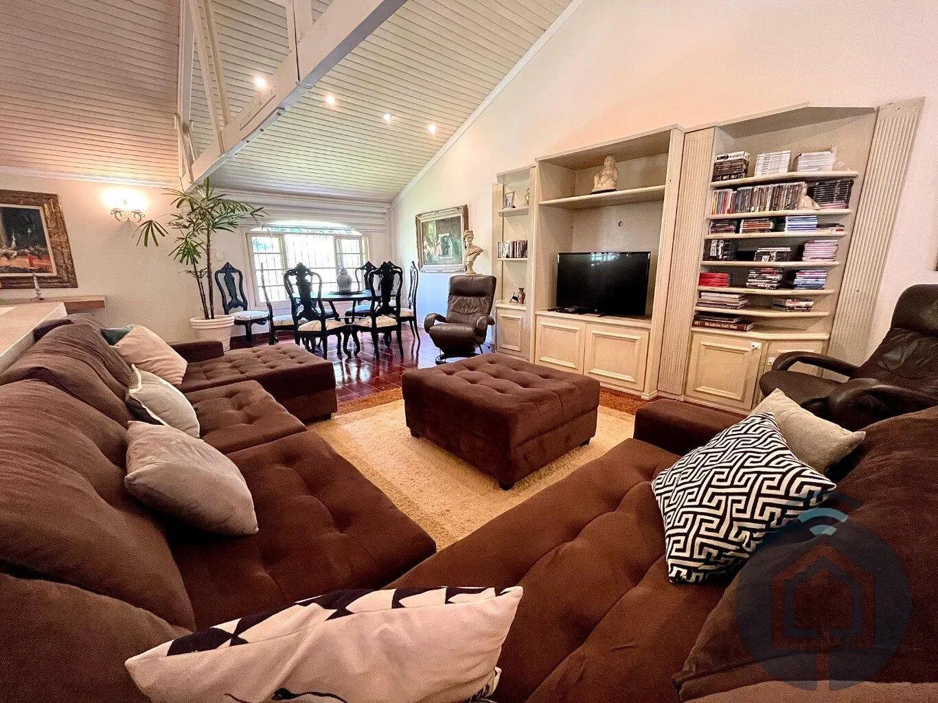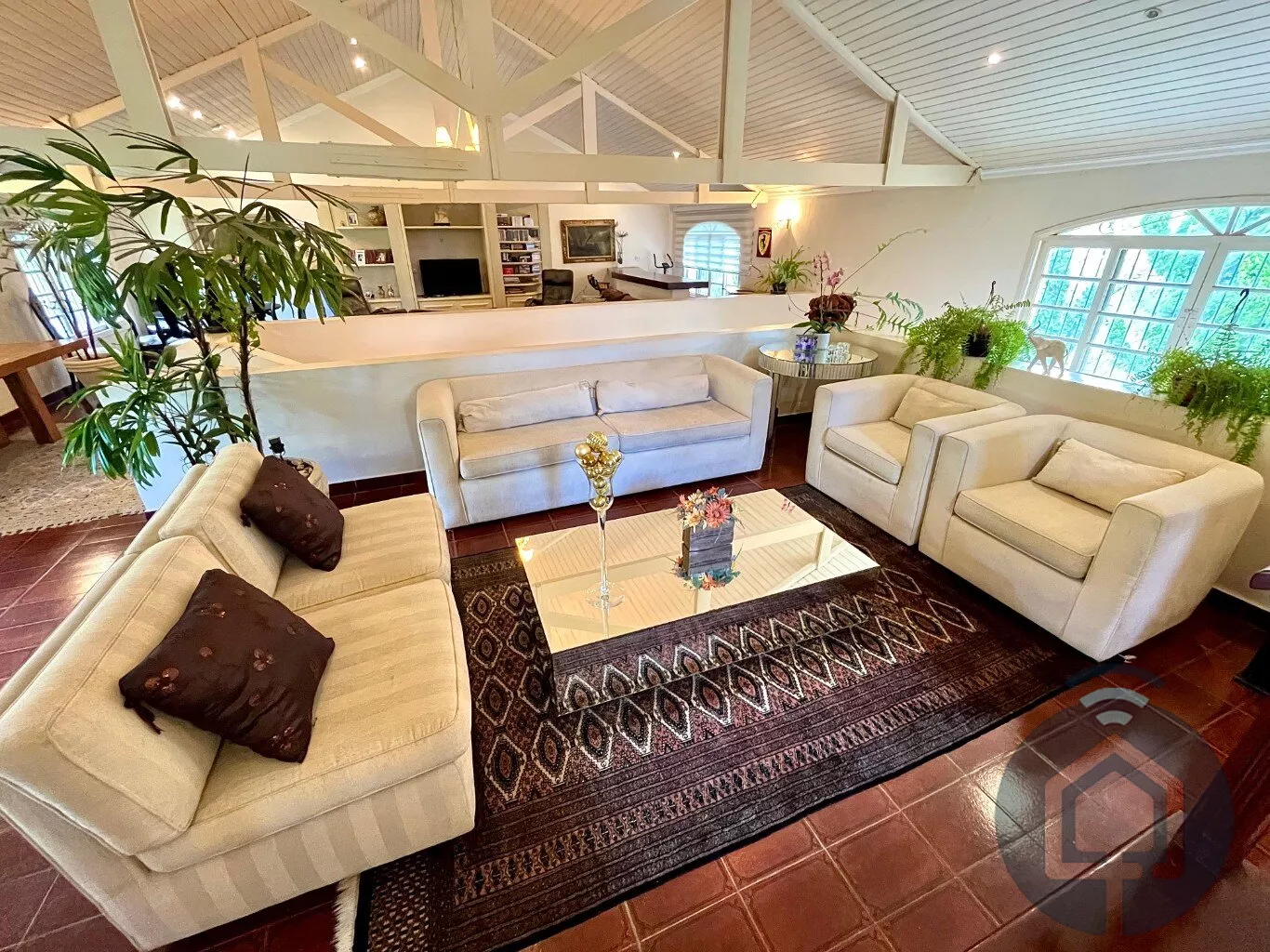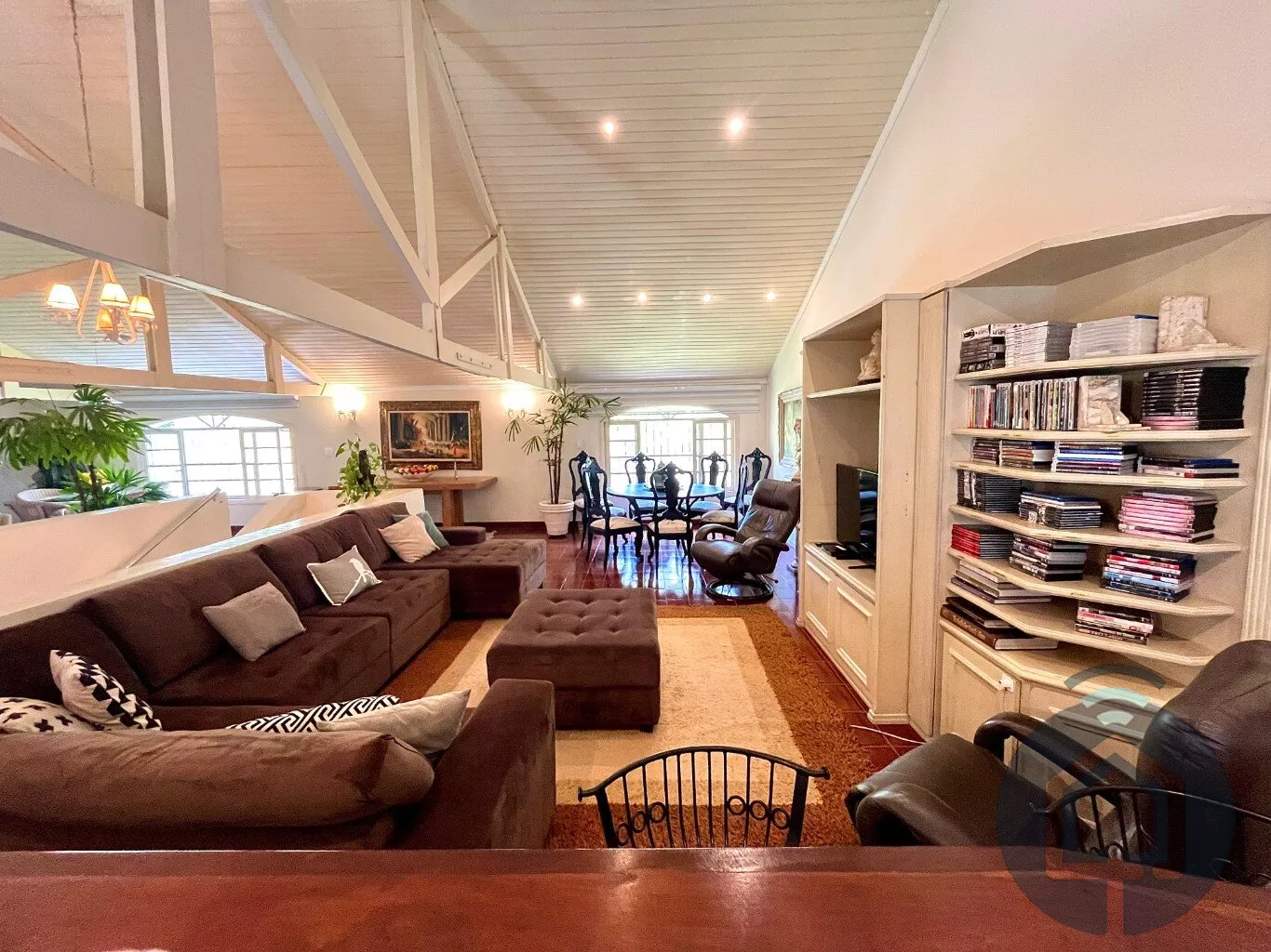 No piso superior, um ambiente impressiona: uma ampla sala com lareira, perfeita para criar até quatro ambientes integrados, decorados com sofisticação e conforto. Há também um lavabo, uma prática cozinha auxiliar, uma sala de TV aconchegante com charmoso bar e acesso a uma varanda, onde a vista para o jardim e a piscina é simplesmente deslumbrante.