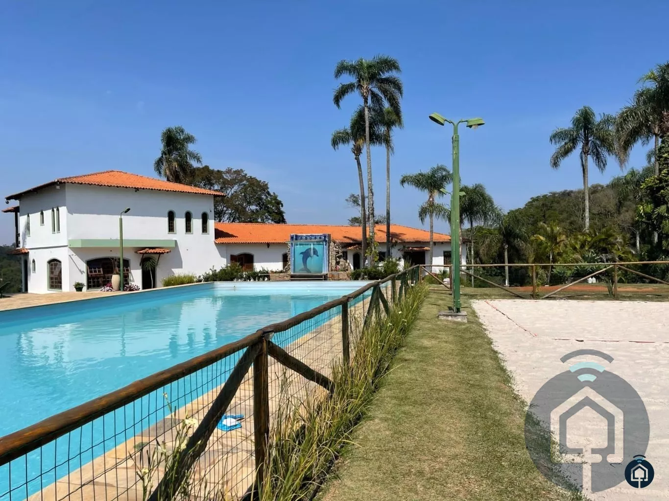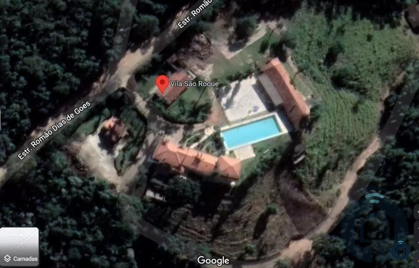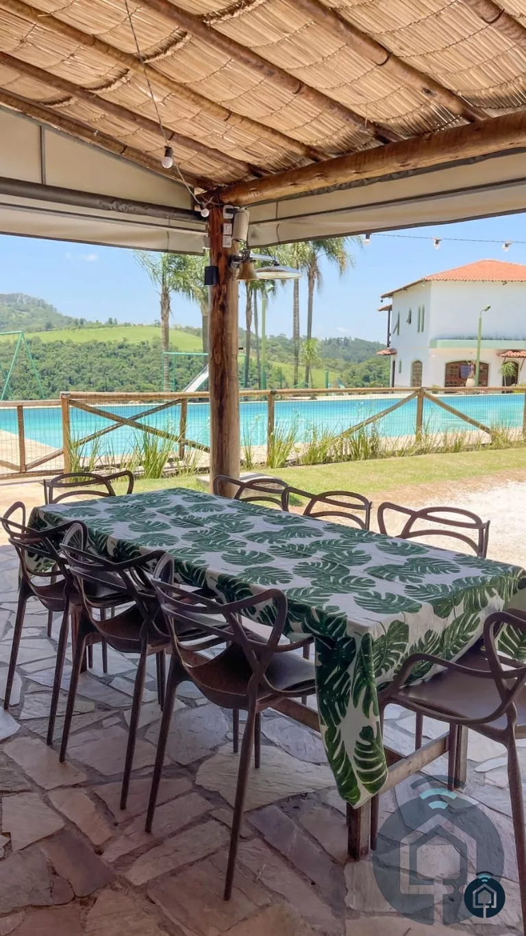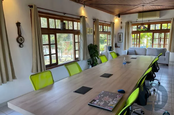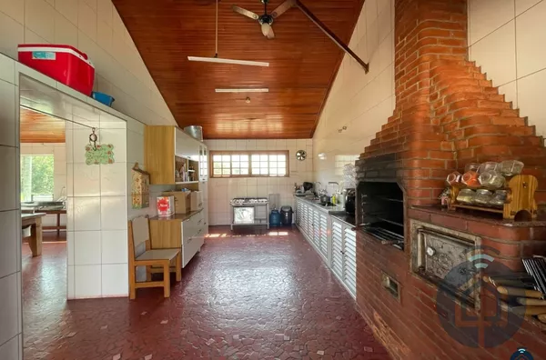 Casa principal com 6 dormitórios, sendo 2 suítes simples e 1 suíte máster, 5 banheiros, living com lareira, sala de jantar, cozinha e salão de jogos com mesa de sinuca e baralho.