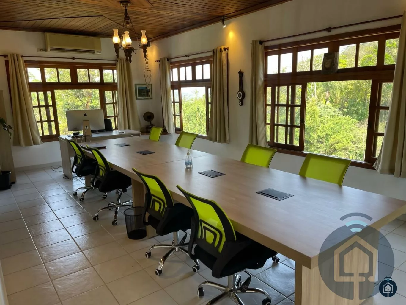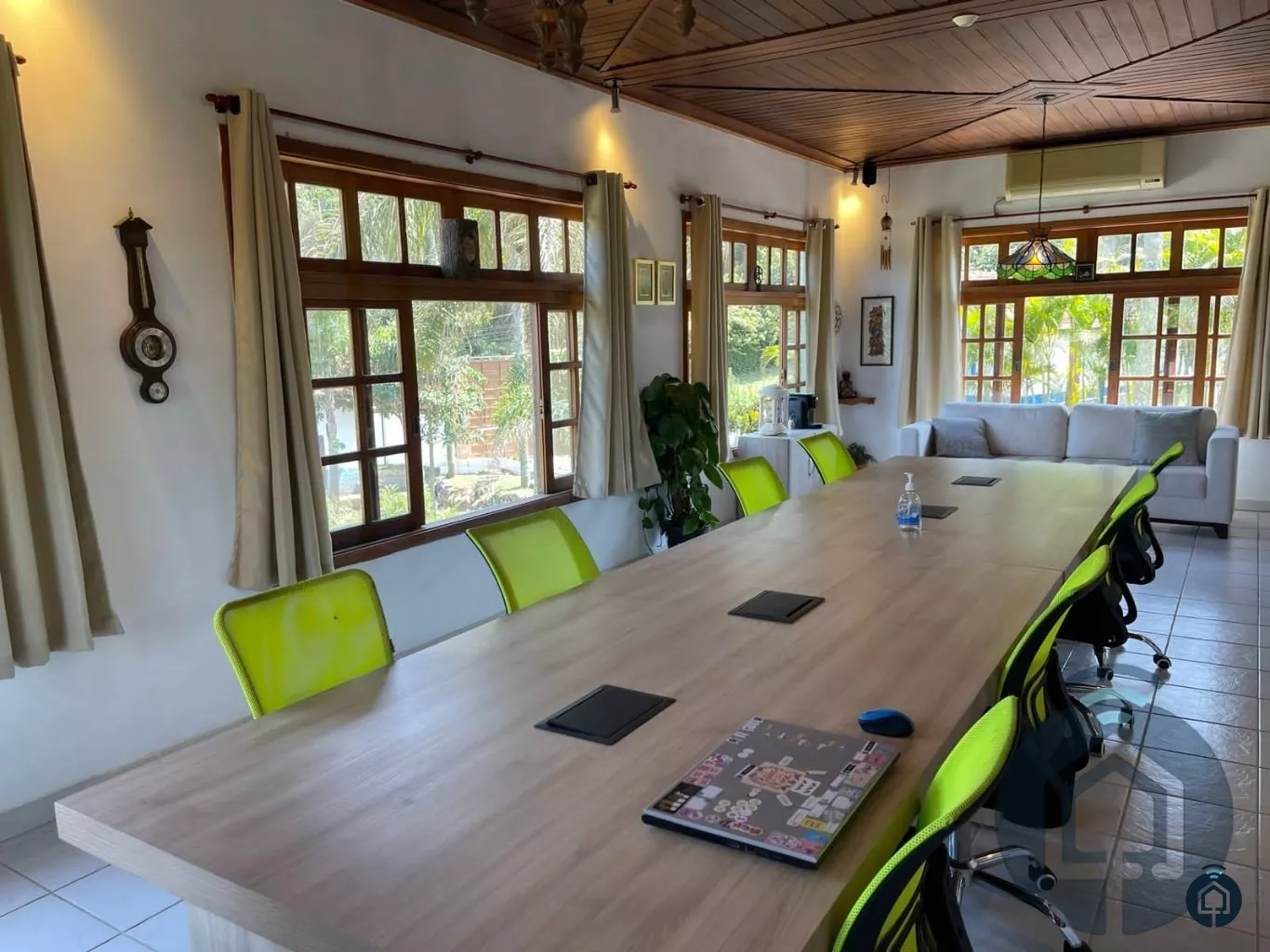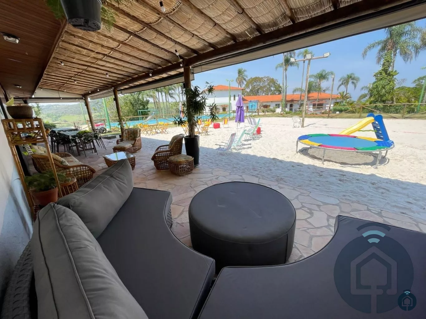 Casa principal com 6 dormitórios, sendo 2 suítes simples e 1 suíte máster, 5 banheiros, living com lareira, sala de jantar, cozinha e salão de jogos com mesa de sinuca e baralho.
