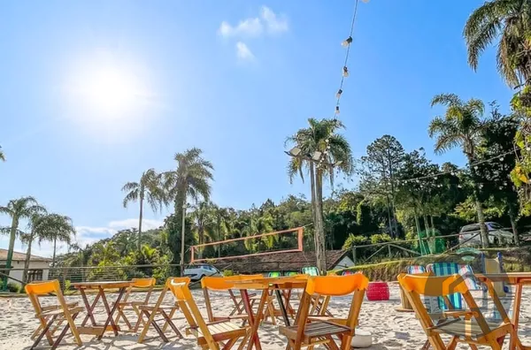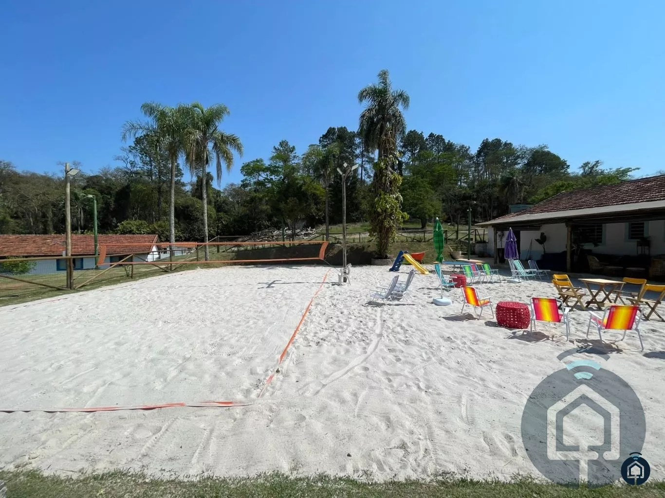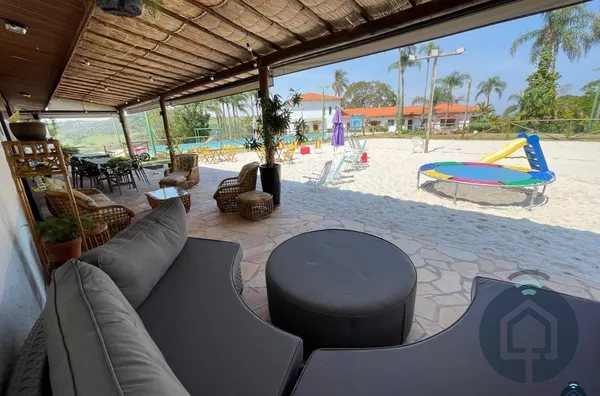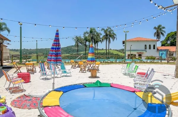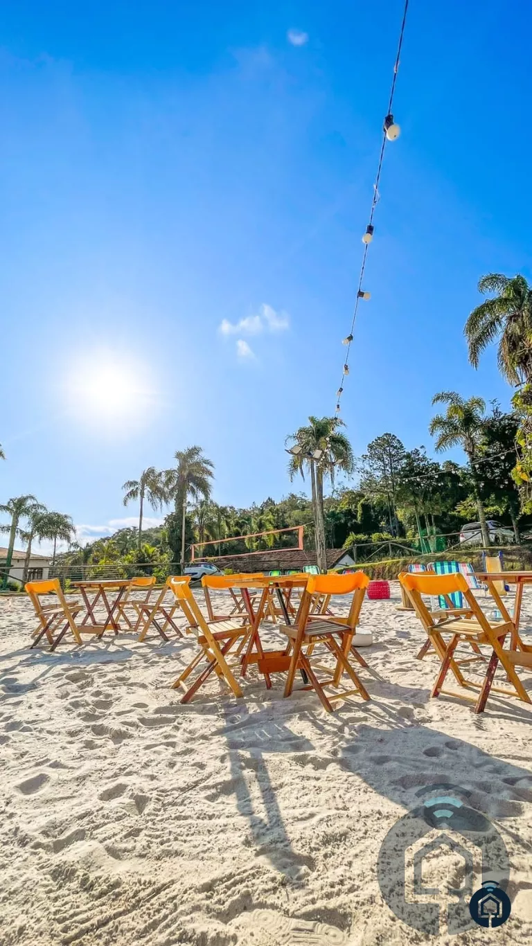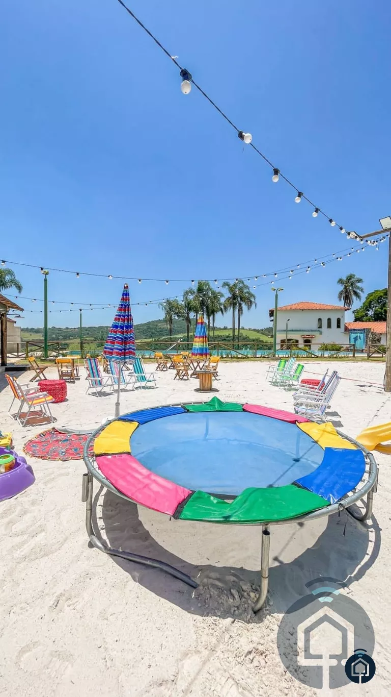 Incrível área de lazer com salão de festas equipado com cozinha com fogão industrial, freezer, 2 geladeiras, churrasqueira, char broiler, mesas e cadeiras para até 70 pessoas, pratos, talheres e louças, prainha com cama elástica, quadra de beach tênis e vôlei de praia, piscina de 30x10 com cascata, sauna seca e úmida, jacuzzi com teto piramidal de vidro, academia com esteira e aparelho de musculação, playground e lago artificial (desativado).