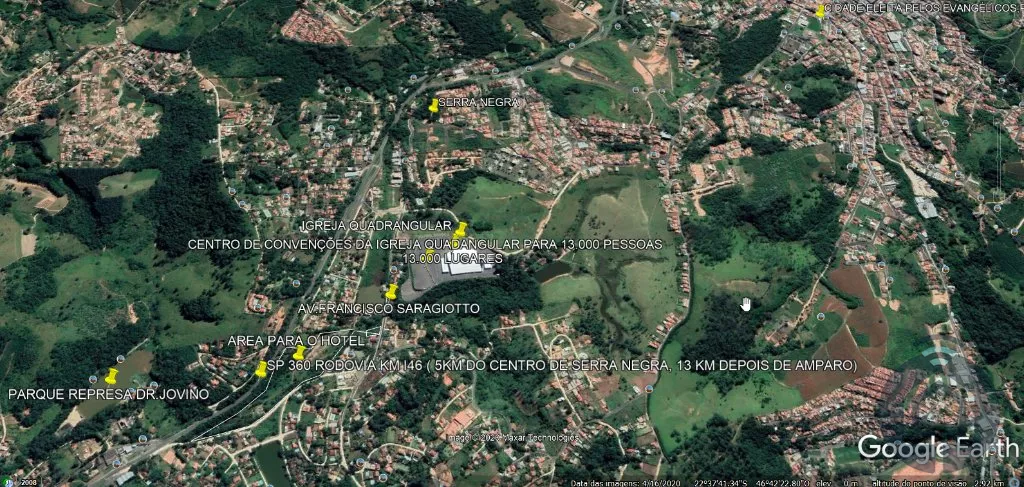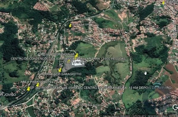 Excelente área para investimento, restaurante de 1.200 m² de construção com uma área de 50.000 m² anexa, já com alicerce para um prédio de 6 pavimentos, com capacidade para 108 apartamentos, ótimo para hotel. Já existe um projeto pronto para um Resort, com restaurante, hotel e área de lazer completa. Aceita parceria para conclusão do projeto ou venda da área total. Localizado no Município Turístico de Serra Negra, a 5 km do Centro da cidade e com fácil acesso a Rodovia. Serra Negra está localizada ao norte do Estado de São Paulo, numa região de 927m de altitude com picos de até 1.300m e rodeada por montanhas da Serra da Mantiqueira, Serra Negra possui um ambiente seguro e agradável, apresenta o turismo tradicional, de compras, de eventos e rural. Seu agradável clima de montanha, aliado às fontes de águas minerais com poderes terapêuticos e sua rica beleza natural, tornaram-lhe conhecida como "Cidade da Saúde".