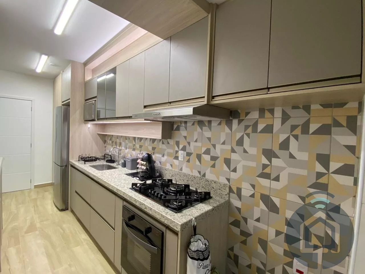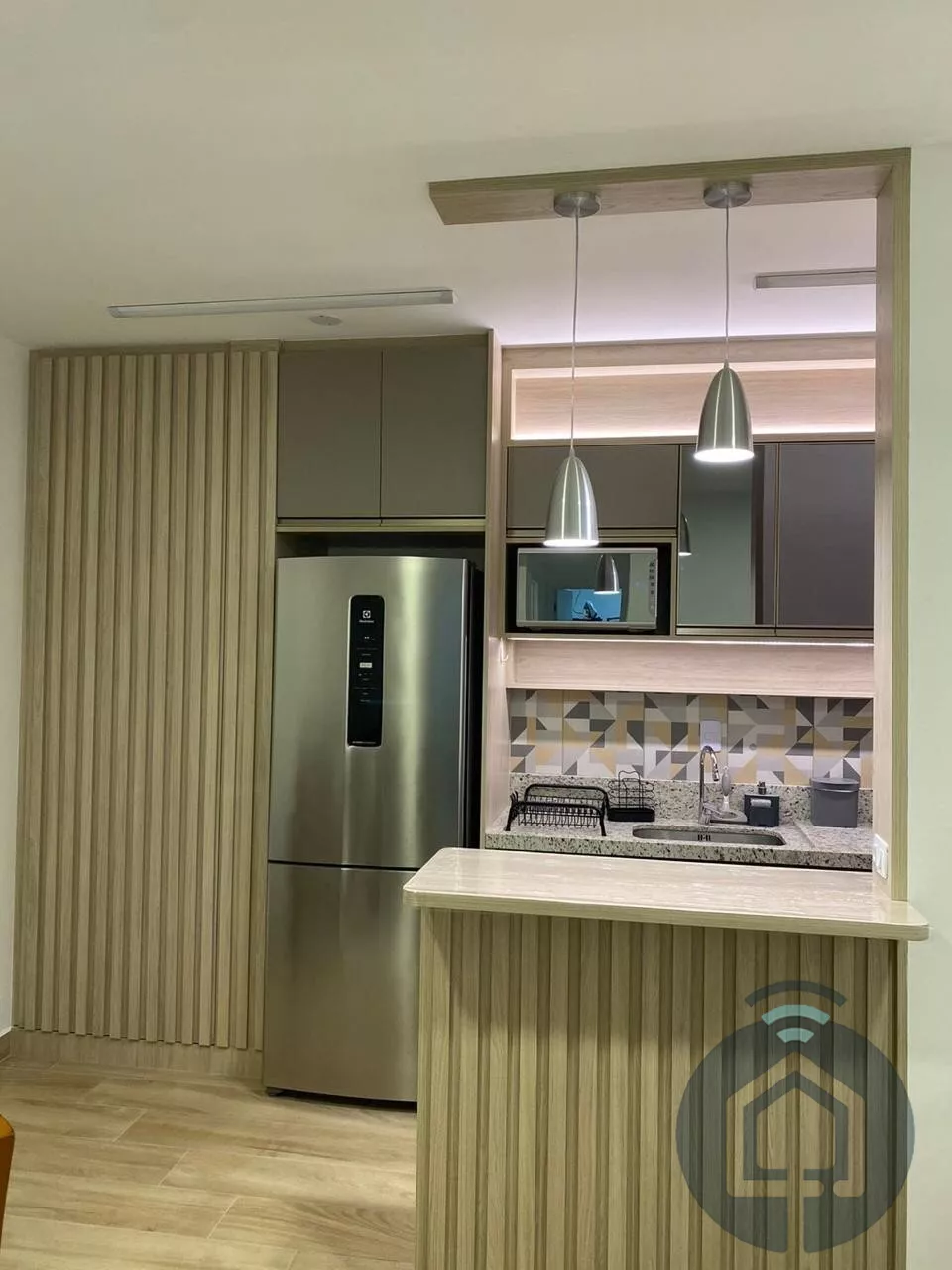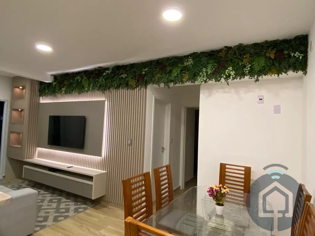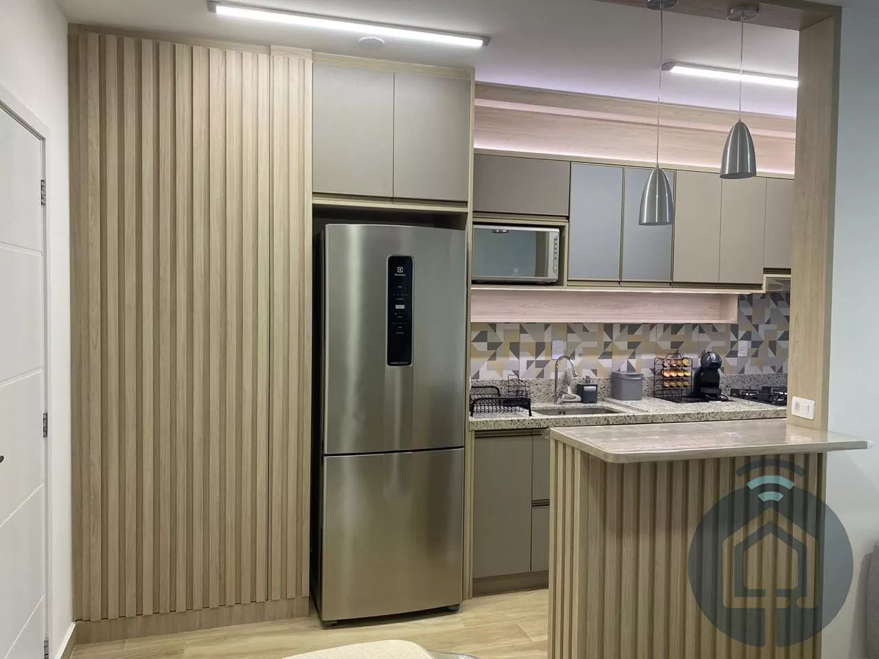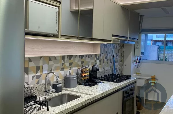 Ao entrar, você encontra uma sala de estar acolhedora, planejada com um painel iluminado que adiciona charme e sofisticação. Integrada à sala de jantar, essa área conecta-se harmoniosamente à cozinha, que já vem equipada com cooktop e espaço otimizado para a lavanderia, completa com máquina de lavar. São dois dormitórios confortáveis, sendo um deles uma suíte e banheiros com acabamentos de alta qualidade.