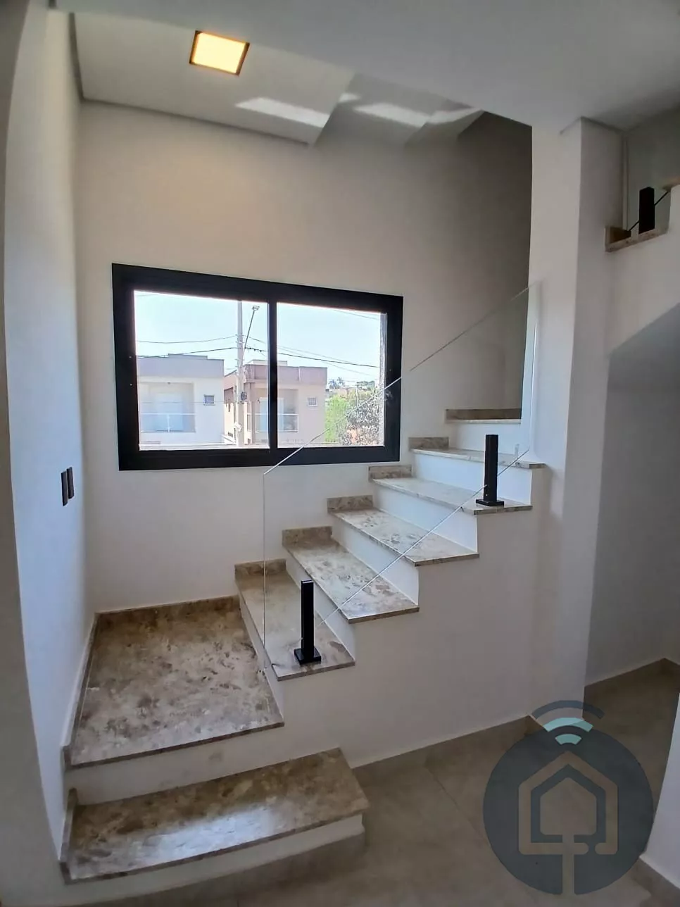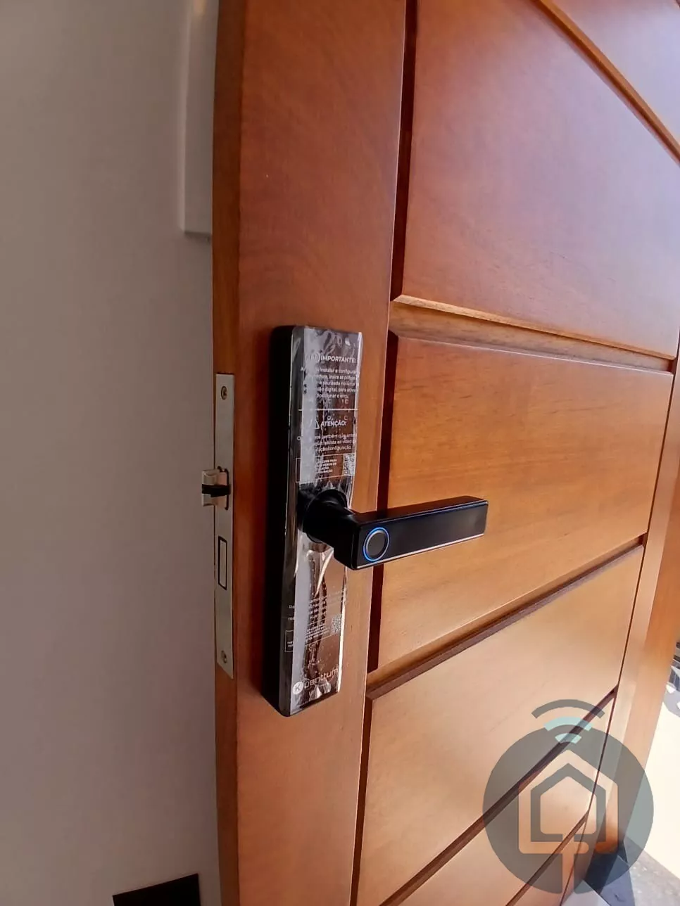 Sofisticação e Elegância: A escada interna em mármore Travertino e o guarda-corpo em vidro trazem uma sensação de leveza e sofisticação para a casa, enquanto a porta de entrada em madeira maciça com fechadura touch-screen oferece segurança com muita praticidade.