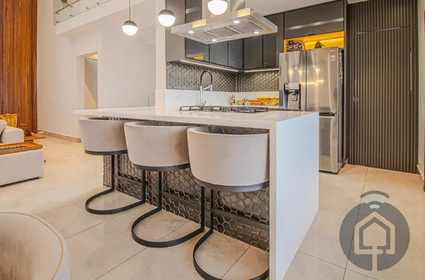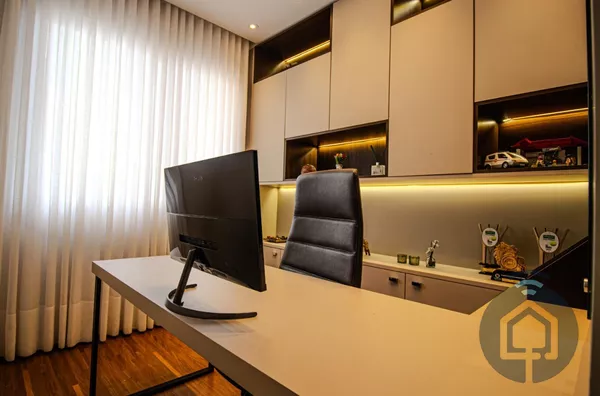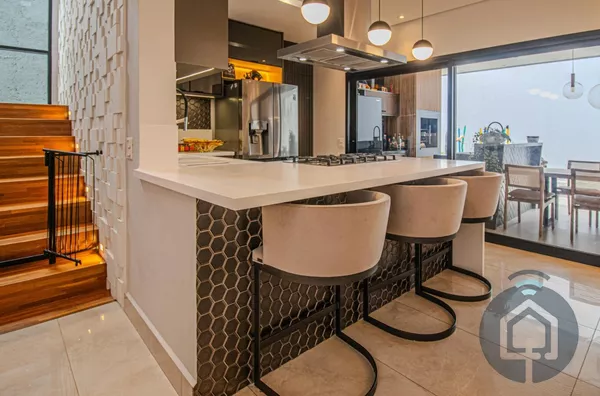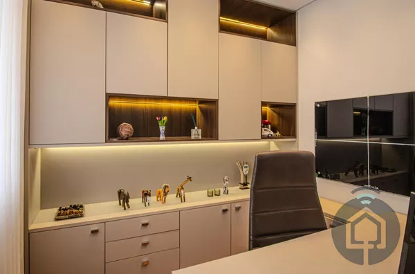 A área social foi projetada para encantar: sala de estar com pé direito alto e lareira a gás, sala de jantar integrada e uma cozinha planejada que une funcionalidade e design moderno. Para quem trabalha ou estuda em casa, um escritório completo e aconchegante faz toda a diferença.