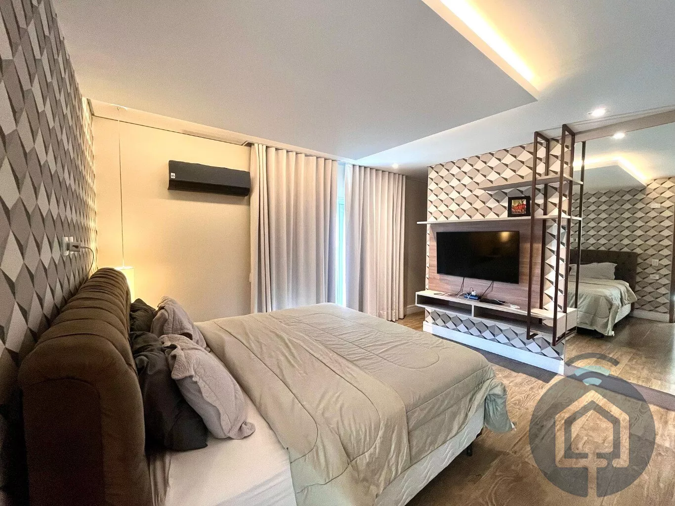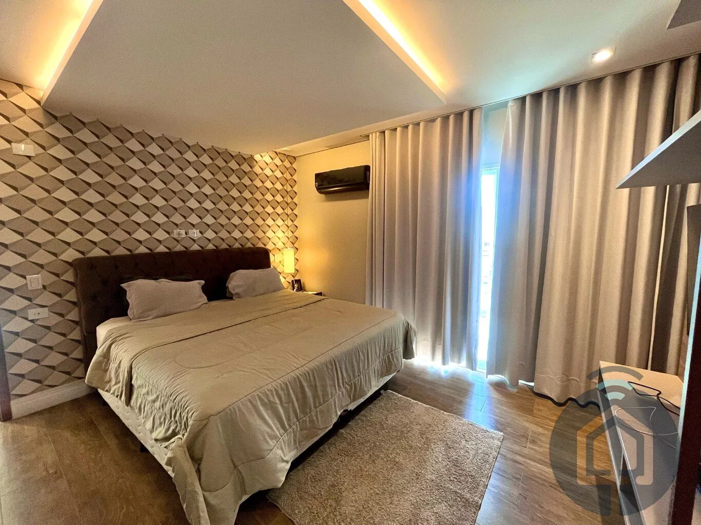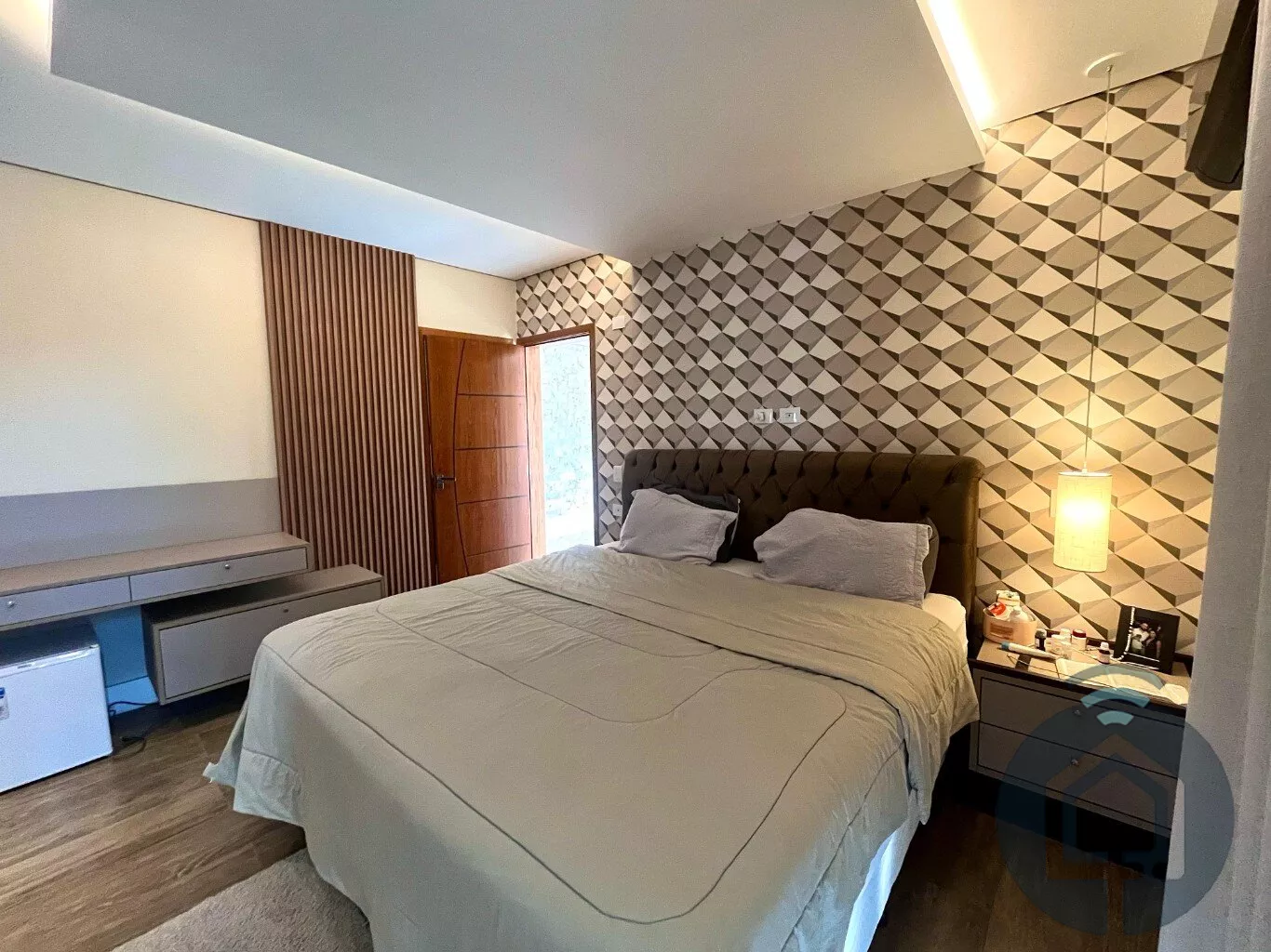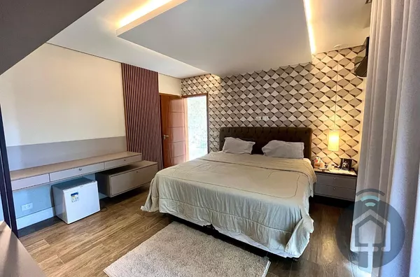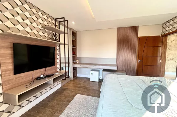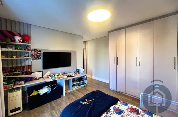No andar superior, a casa possui três suítes, todas com varanda. A suíte máster se destaca pelo closet planejado, enquanto uma das suítes simples já conta com armário planejado.