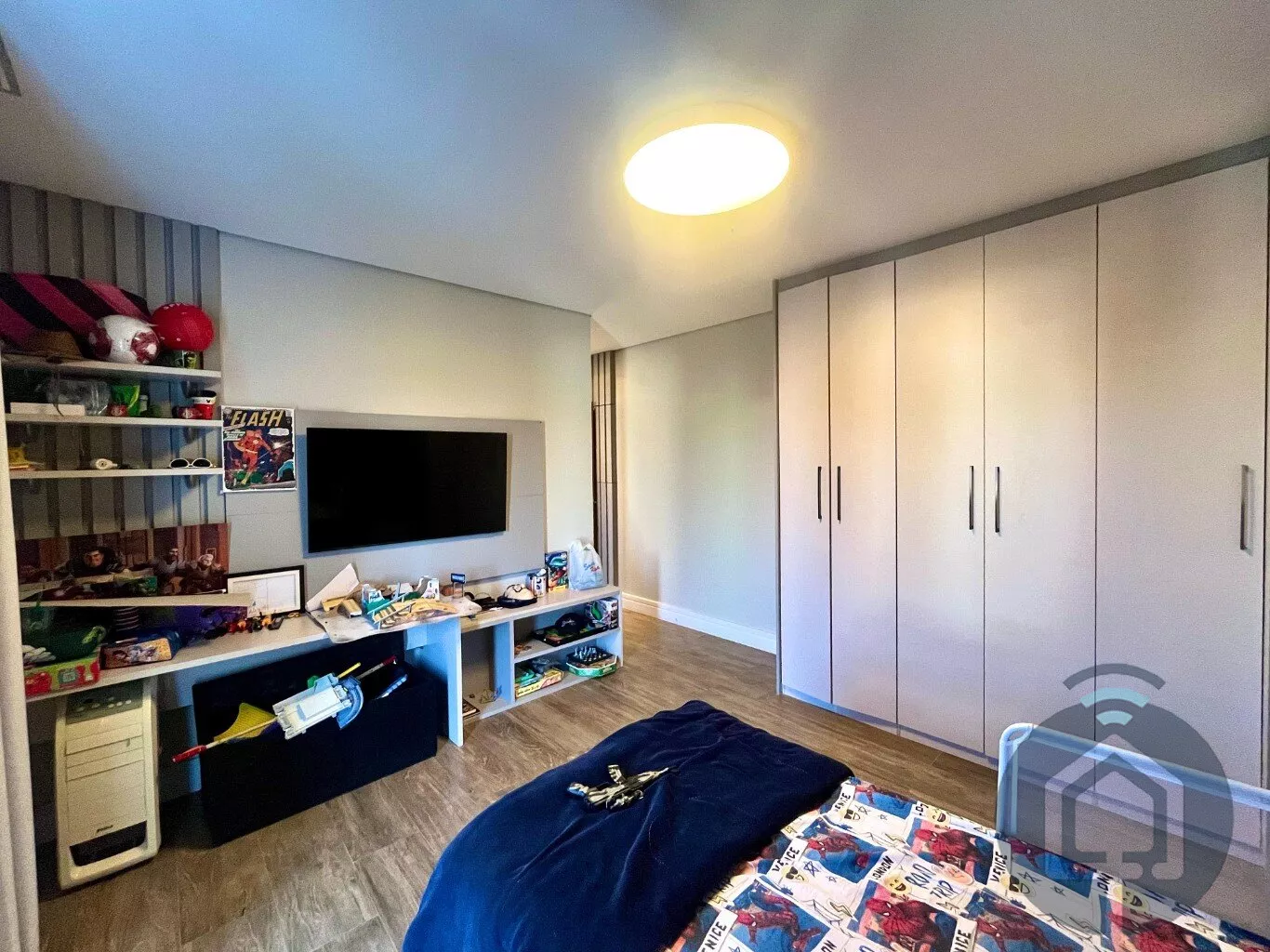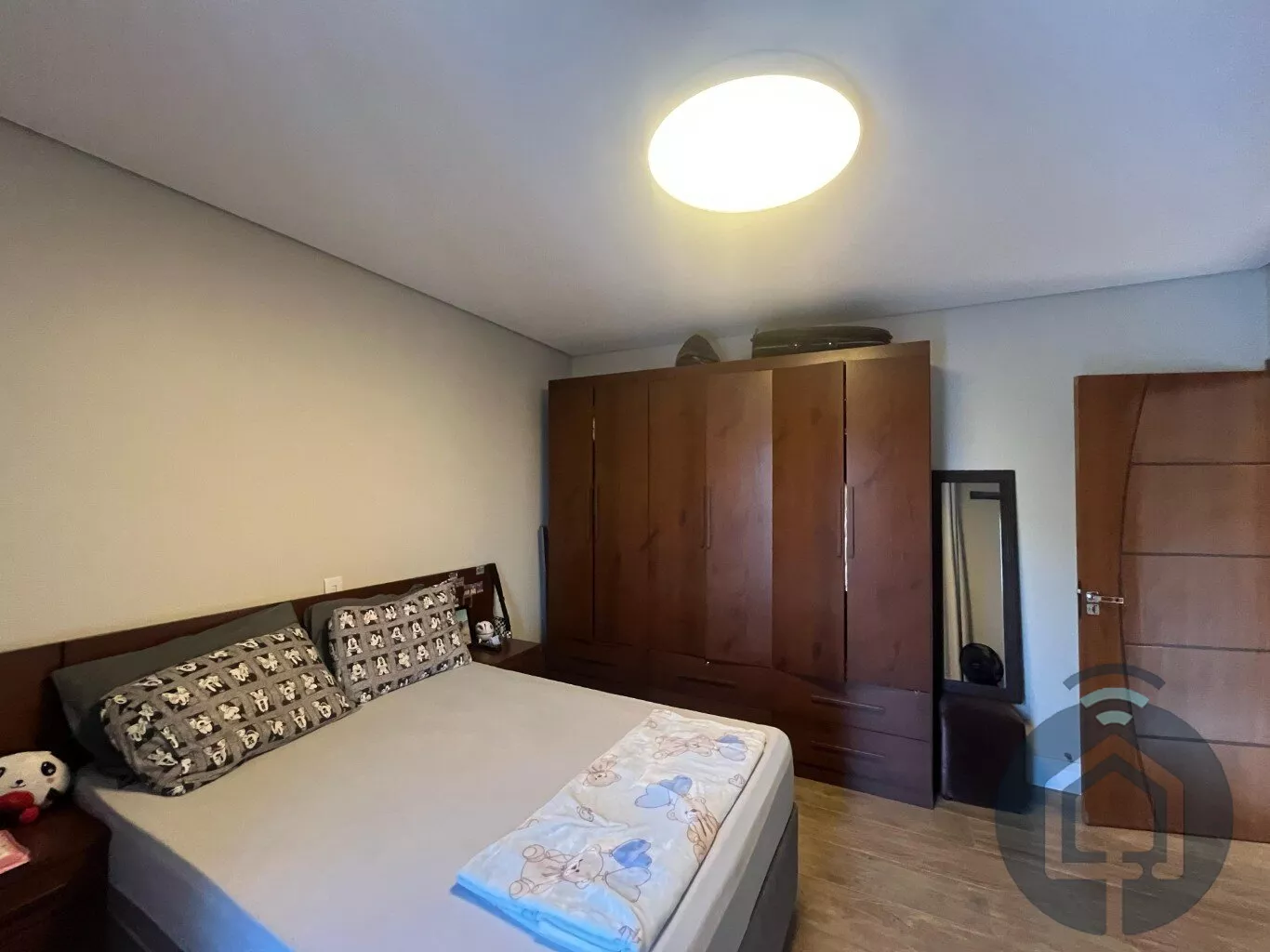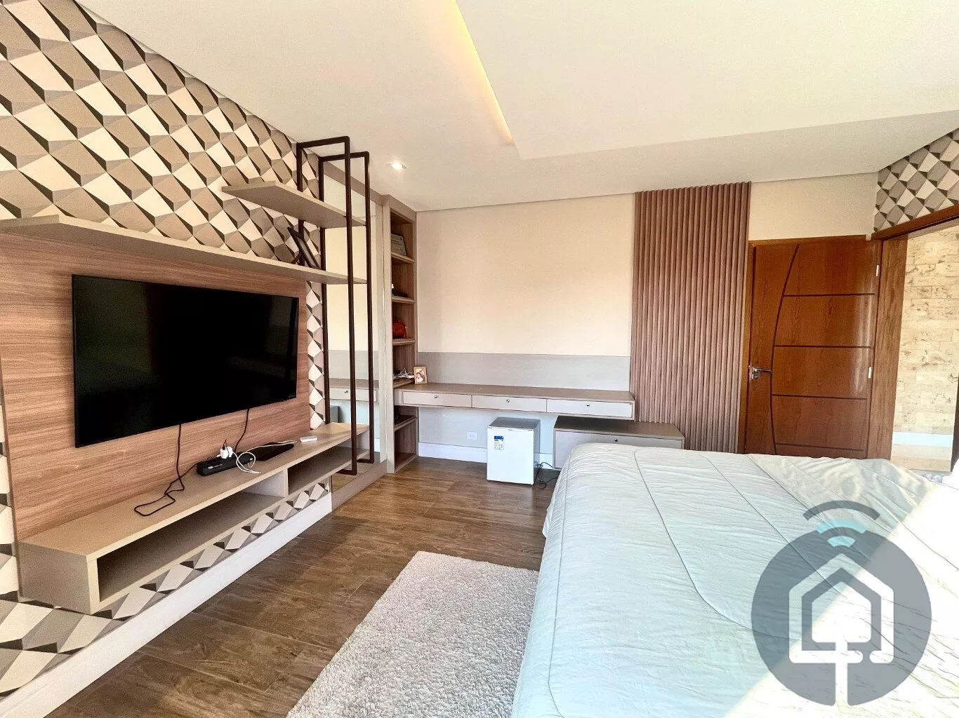No andar superior, a casa possui três suítes, todas com varanda. A suíte máster se destaca pelo closet planejado, enquanto uma das suítes simples já conta com armário planejado.