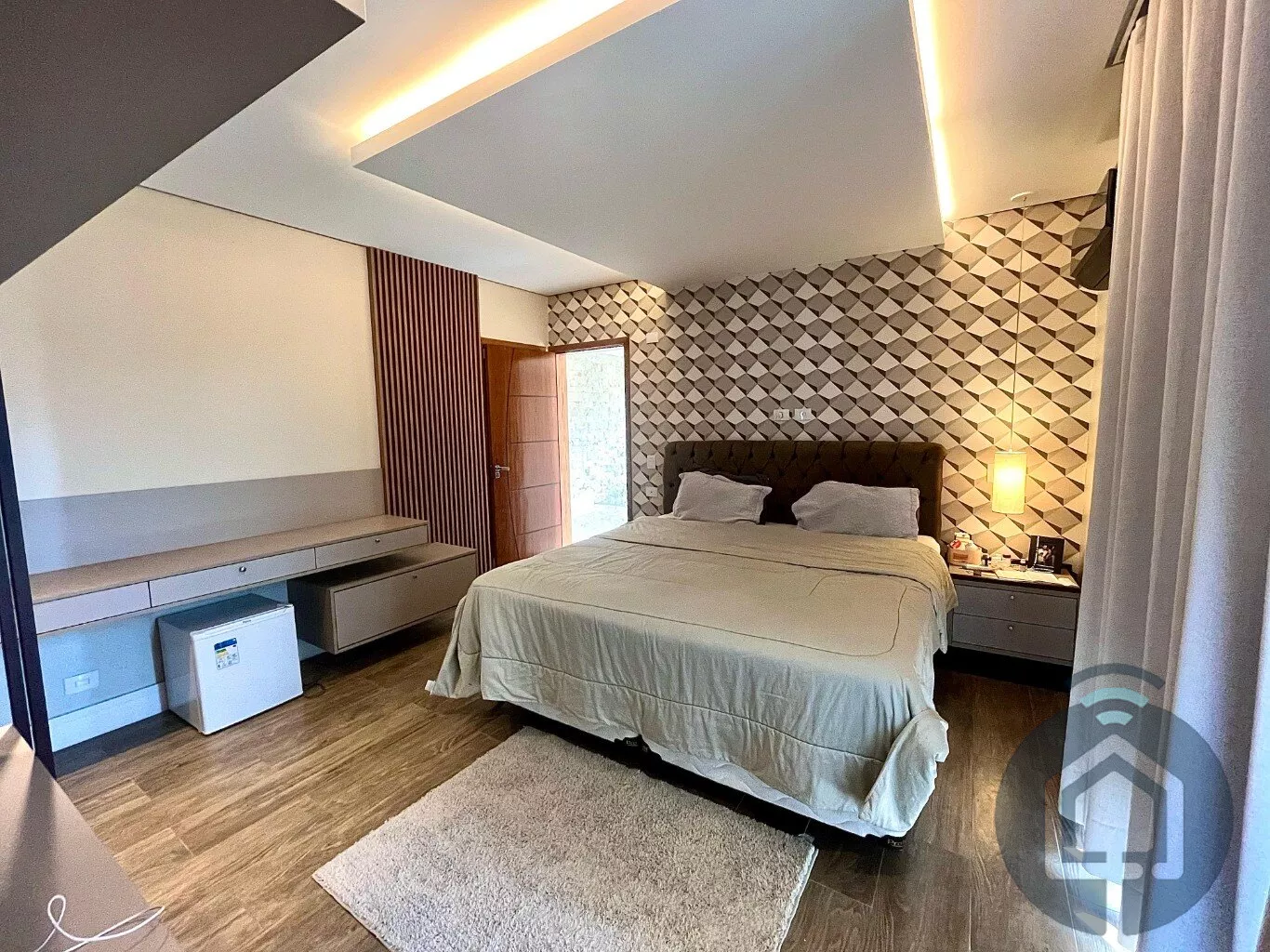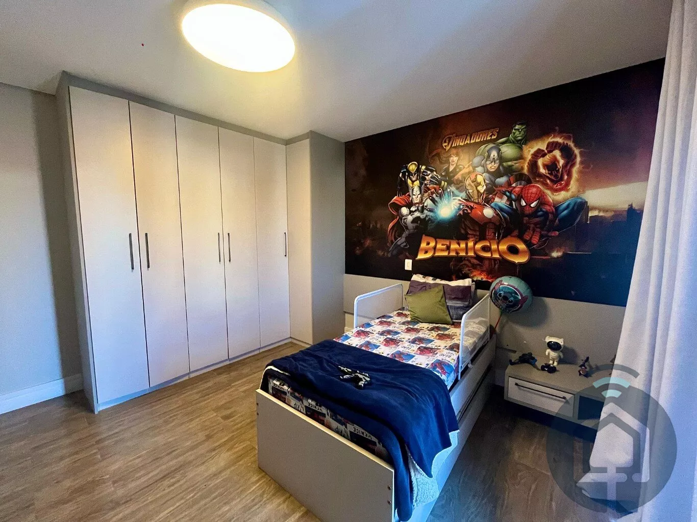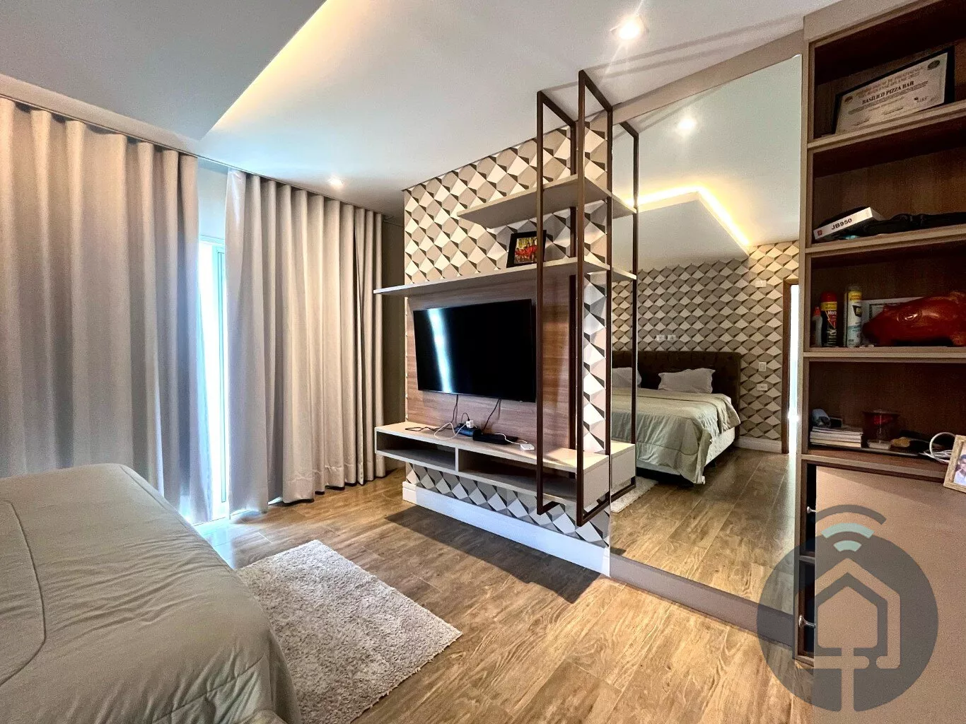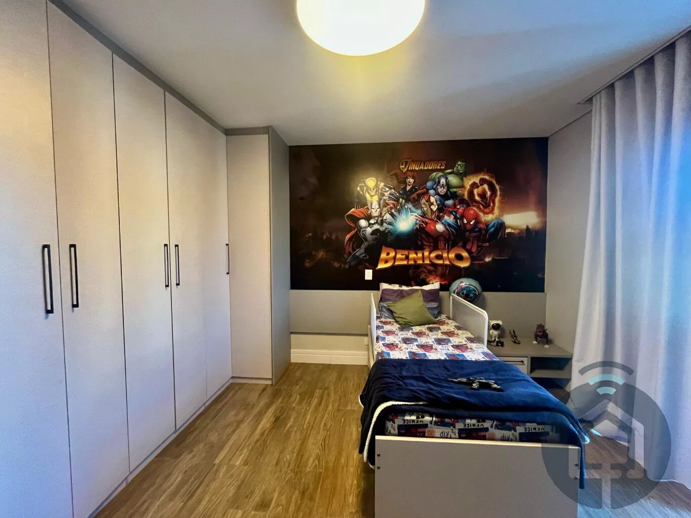 No andar superior, a casa possui três suítes, todas com varanda. A suíte máster se destaca pelo closet planejado, enquanto uma das suítes simples já conta com armário planejado.