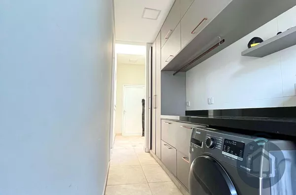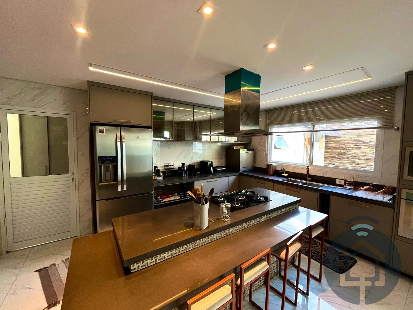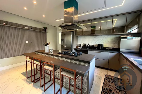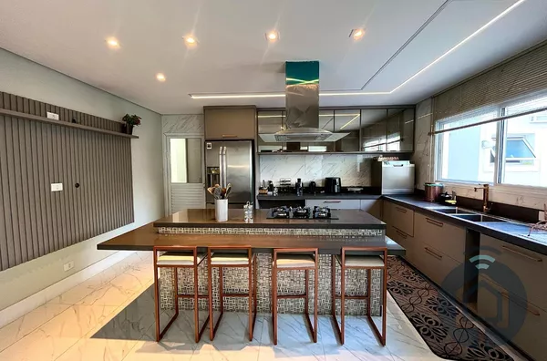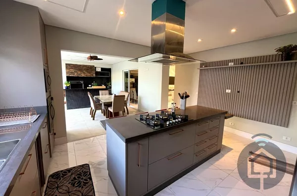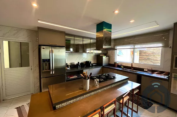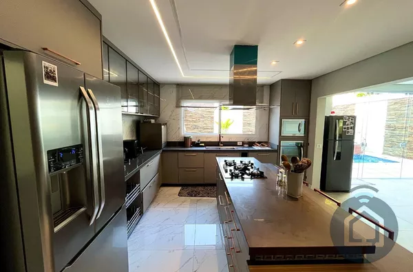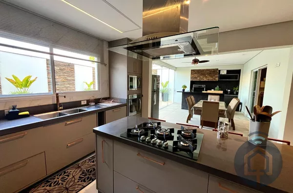 Ainda no térreo, a casa conta com um escritório com móveis planejados, ideal para quem precisa de um espaço para home office. A cozinha é ampla e funcional, equipada com armários planejados, ilha com cooktop e balcão, além de uma lavanderia com armários planejados para facilitar o dia a dia.