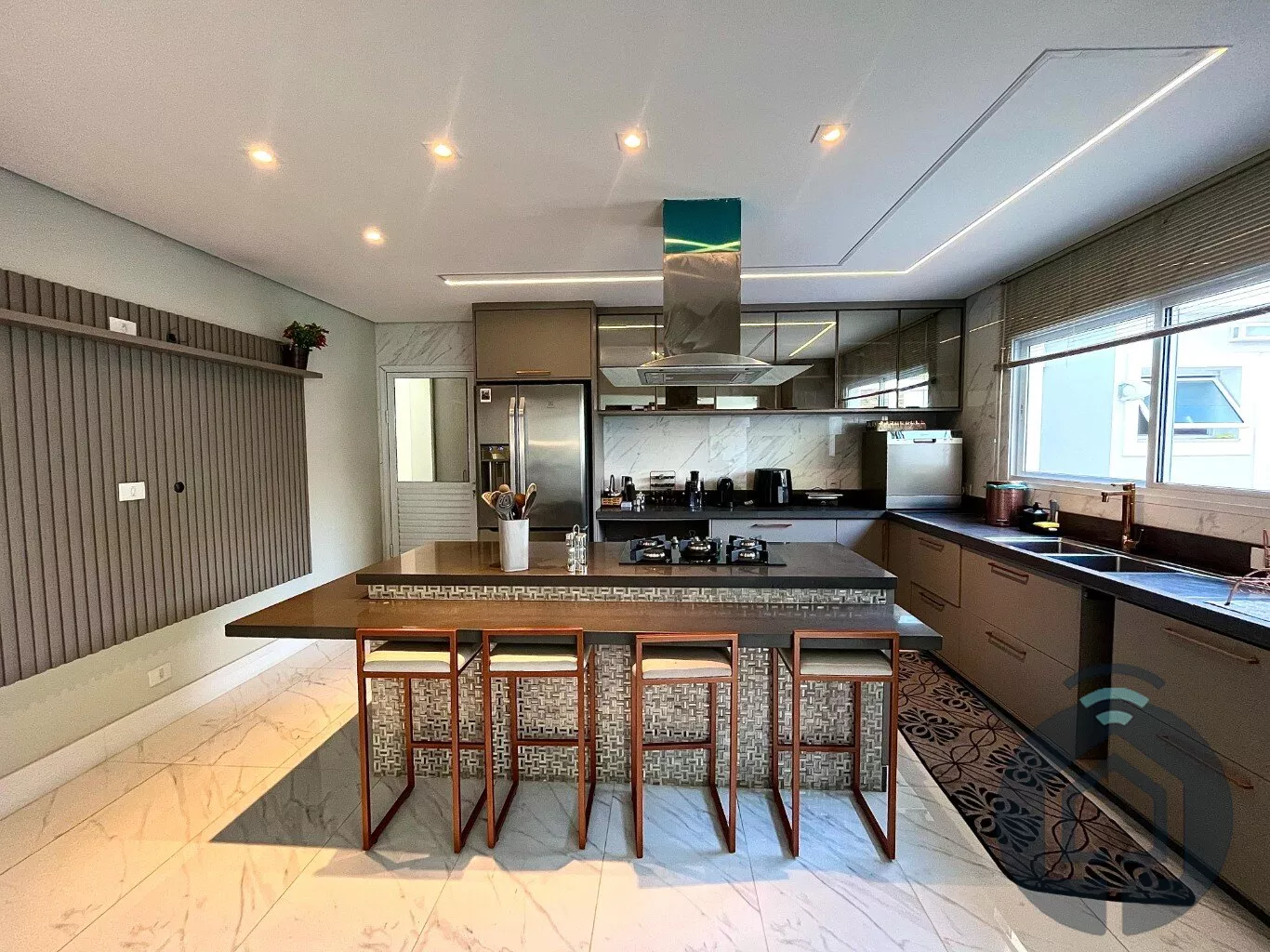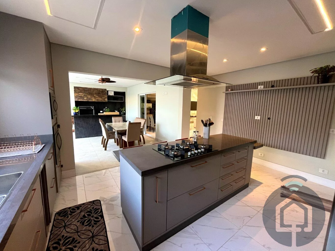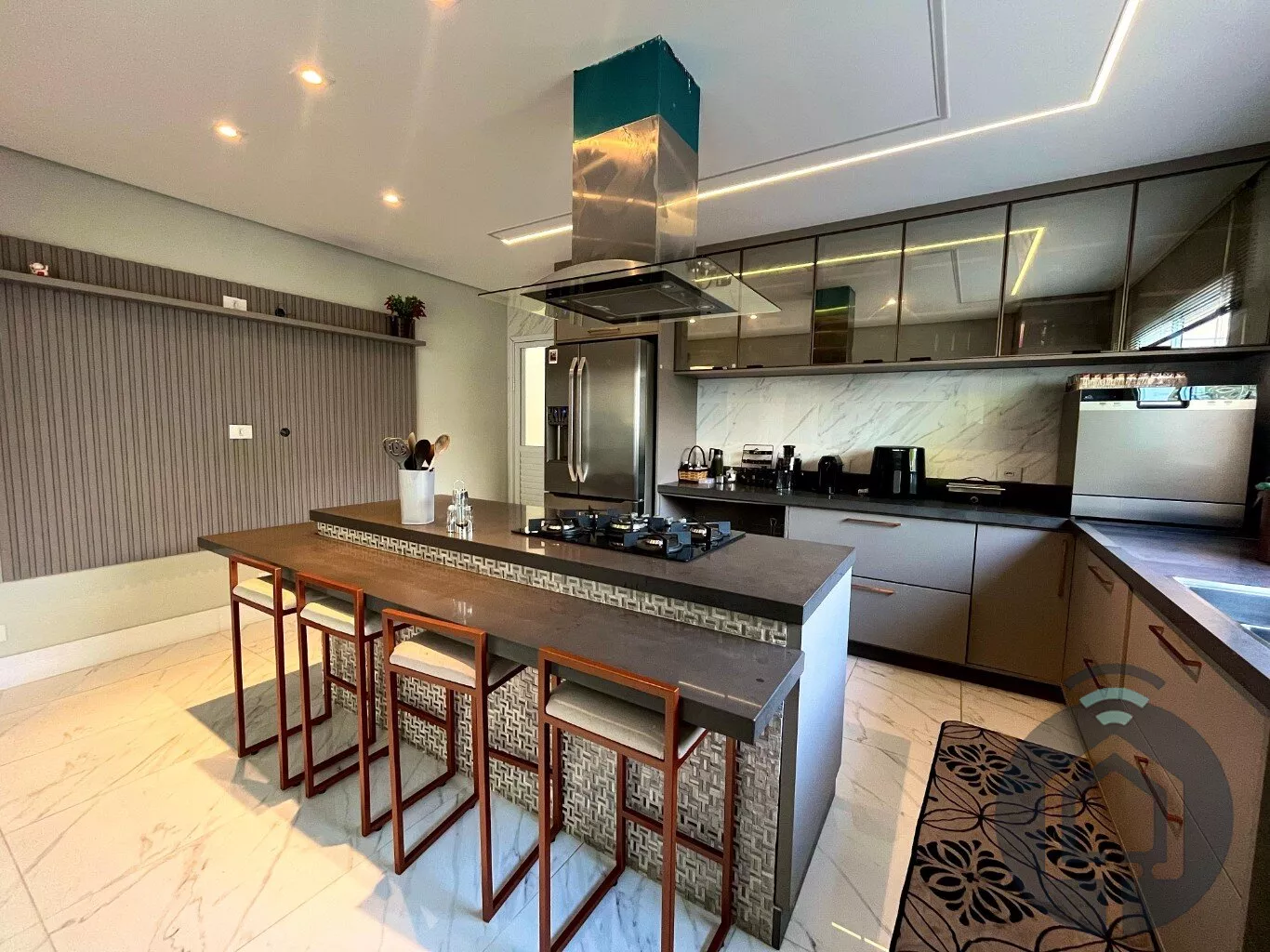 Ainda no térreo, a casa conta com um escritório com móveis planejados, ideal para quem precisa de um espaço para home office. A cozinha é ampla e funcional, equipada com armários planejados, ilha com cooktop e balcão, além de uma lavanderia com armários planejados para facilitar o dia a dia.