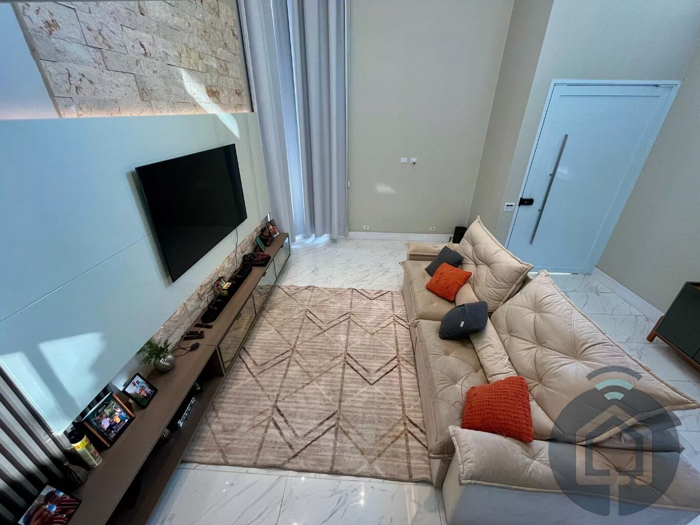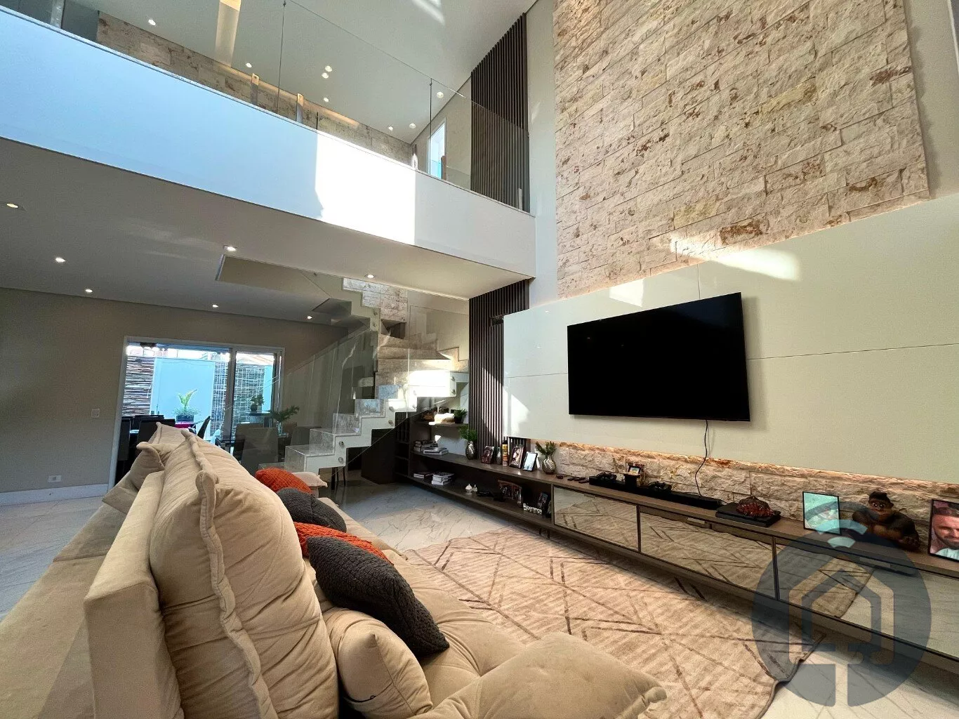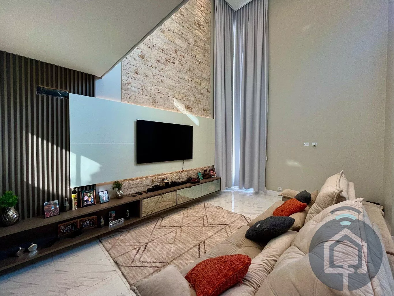 Esta casa em condomínio fechado de alto padrão é a combinação perfeita de elegância, conforto e funcionalidade. Ao entrar, você será recebido por uma sala de estar ampla, com pé-direito alto e uma linda parede de pedra, que traz sofisticação ao ambiente. Integrado à sala de estar, há uma adega planejada e um espaço aconchegante para a sala de jantar. Para maior praticidade, um lavabo está disponível para atender as visitas.