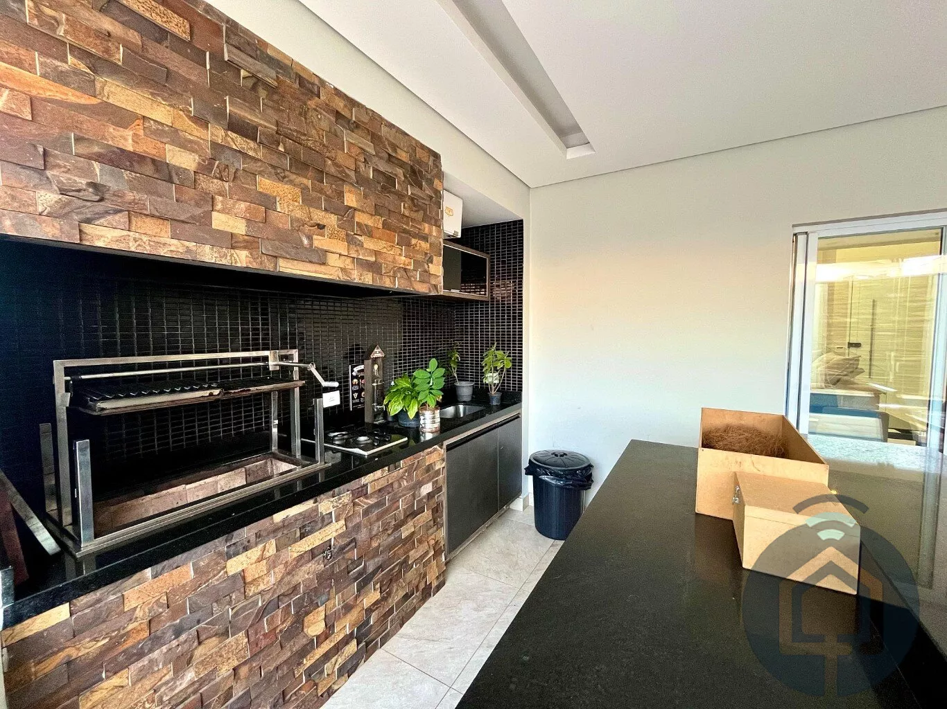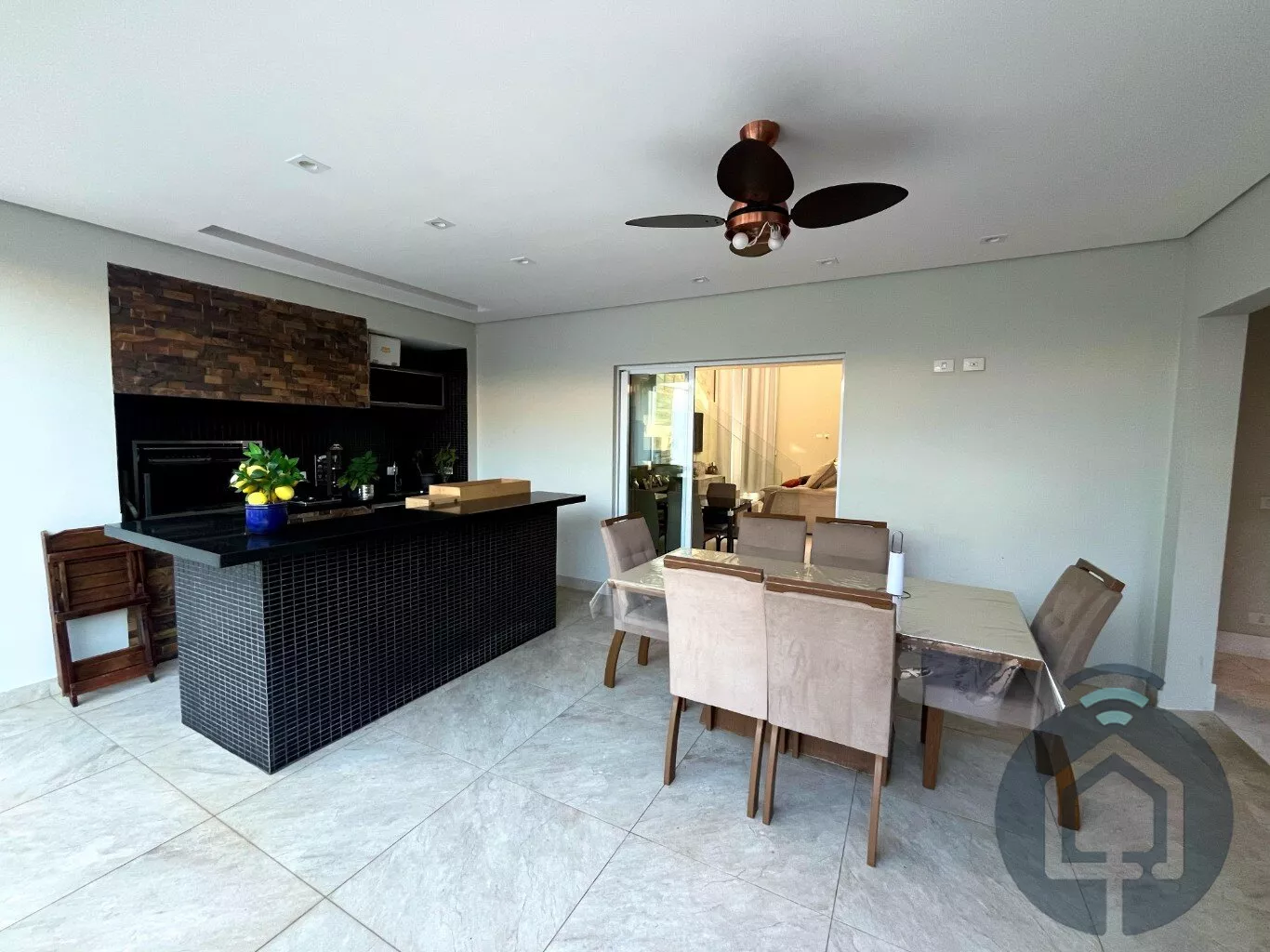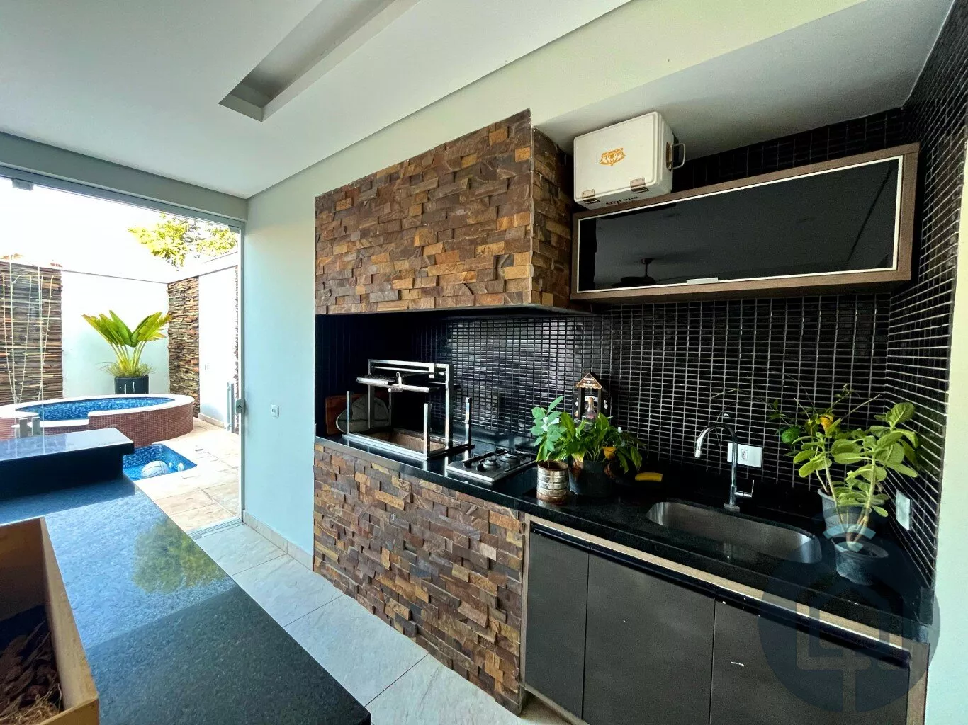 A área gourmet é um verdadeiro convite para momentos especiais. Coberta e totalmente integrada à sala de jantar e à cozinha, ela conta com churrasqueira, cooktop e fechamento em vidro, permitindo a conexão perfeita com o quintal. O espaço externo oferece uma piscina aquecida e um ofurô, proporcionando lazer e relaxamento. Para maior comodidade, há ainda um lavabo externo exclusivo para atender essa área.