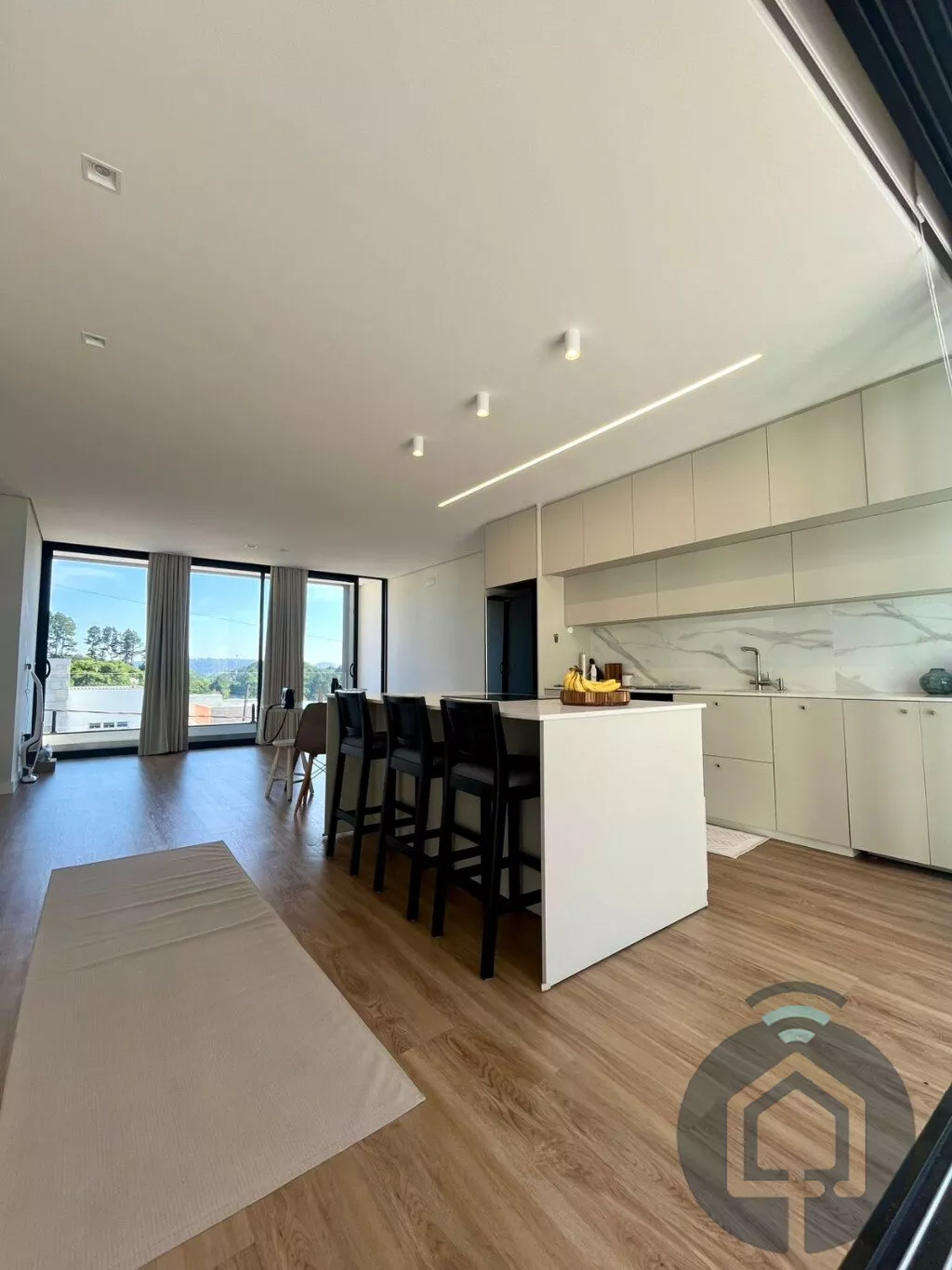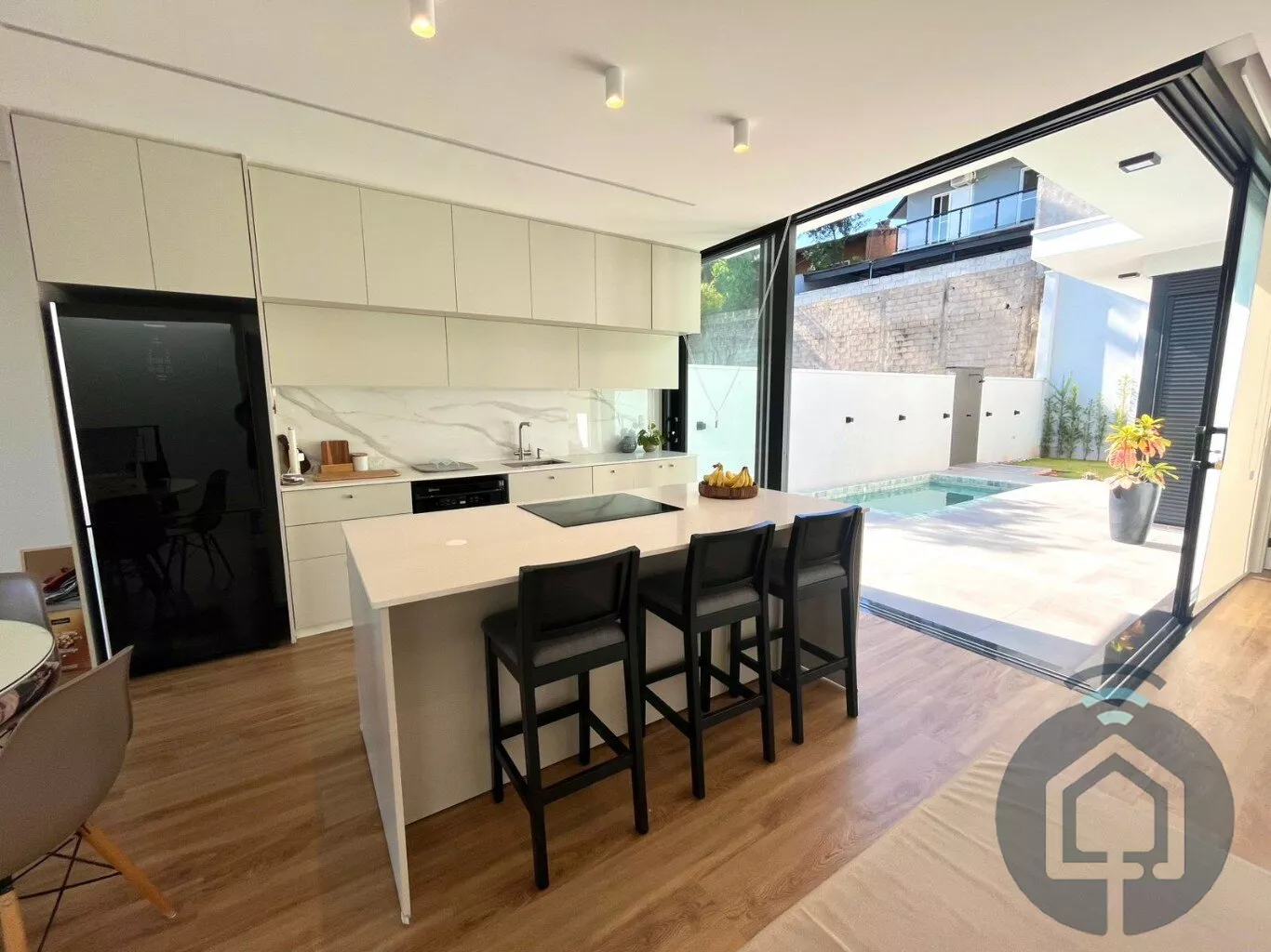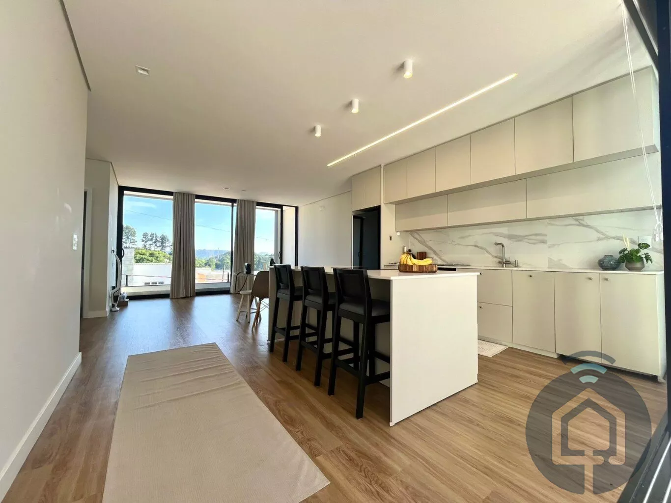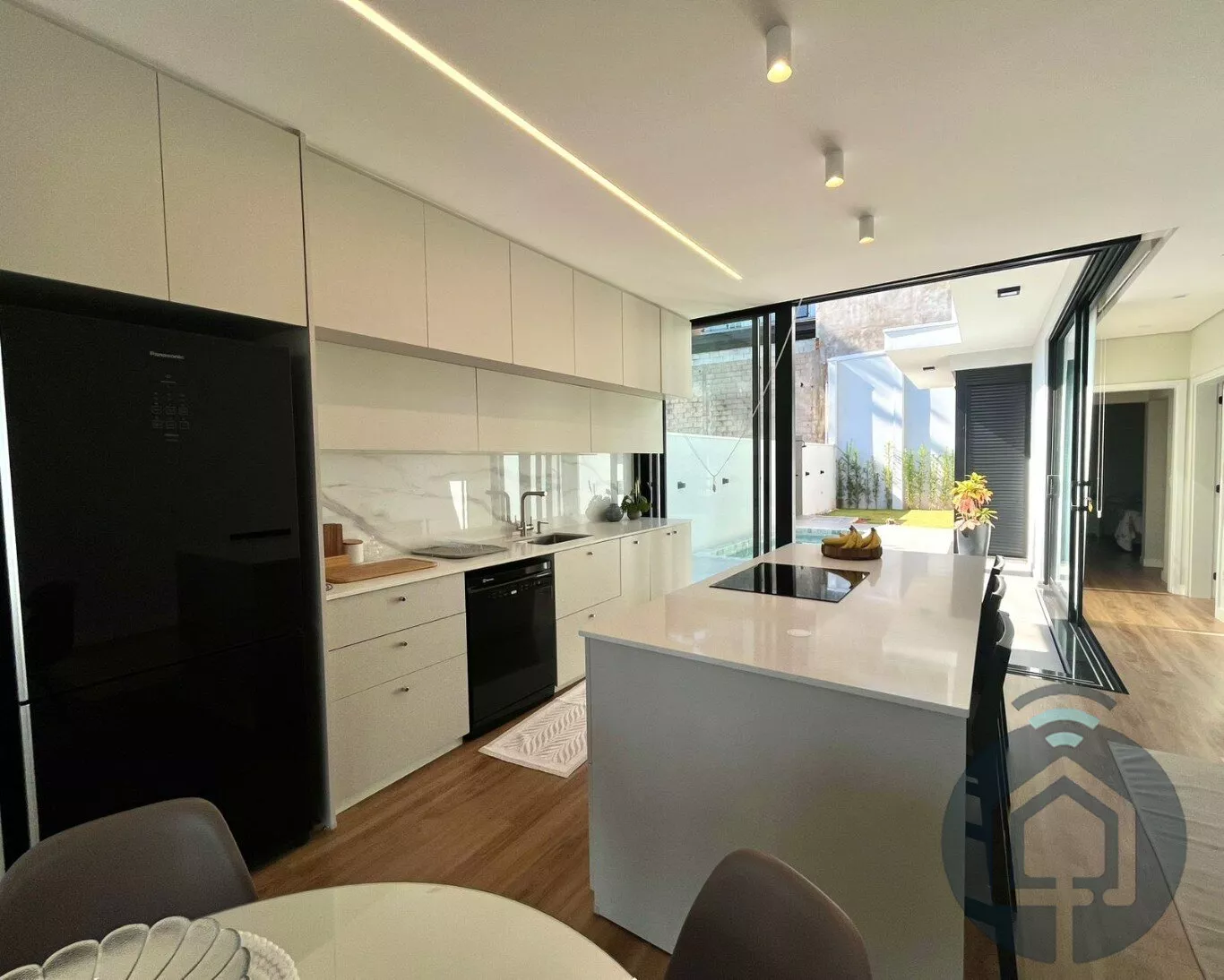 A área social é um convite ao bem-estar: a sala de estar é integrada à cozinha e se abre para uma ampla varanda com uma vista encantadora. A cozinha, equipada com móveis planejados de alto padrão, cooktop de indução e forno embutido, é perfeita para quem aprecia design e funcionalidade. Toda essa área se conecta visualmente ao quintal, criando uma sensação de leveza e integração com o exterior.