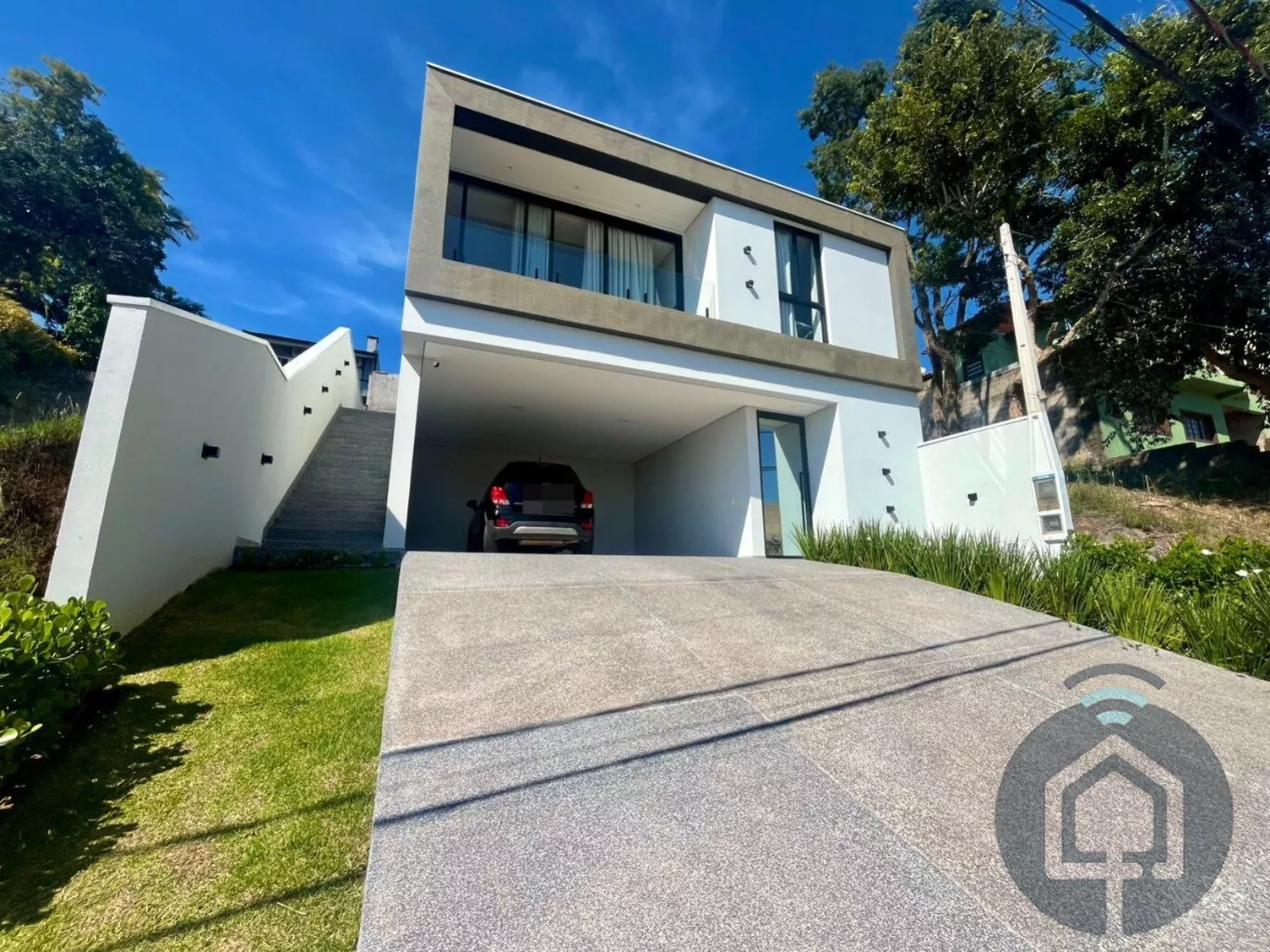 A casa oferece duas vagas de garagem cobertas. Conta ainda com fino acabamento, preparação para aquecimento solar tanto na casa quanto na piscina (faltando apenas a instalação das placas e do boiler), além de infraestrutura pronta para ar-condicionado nos quartos e na sala, e persianas e cortinas sob medida.