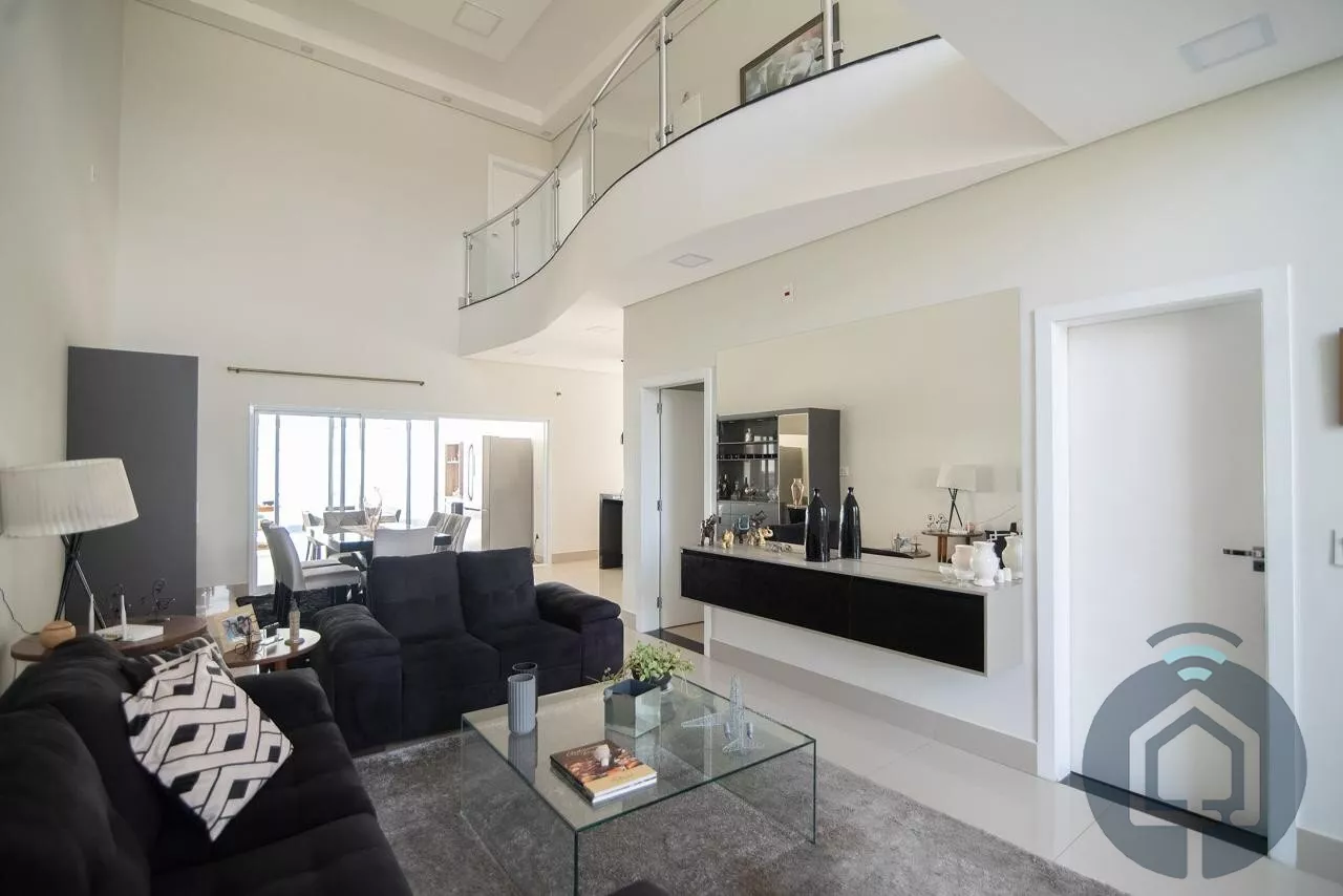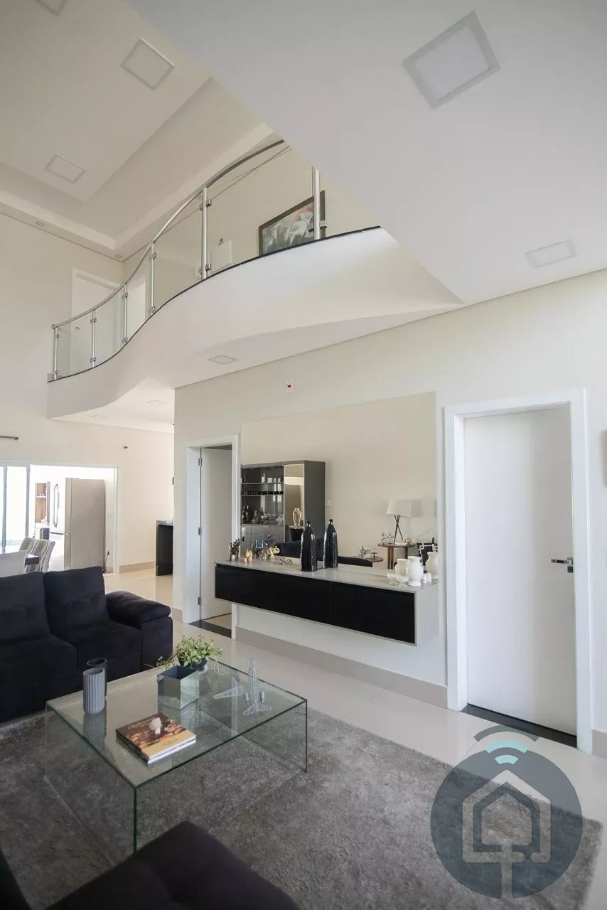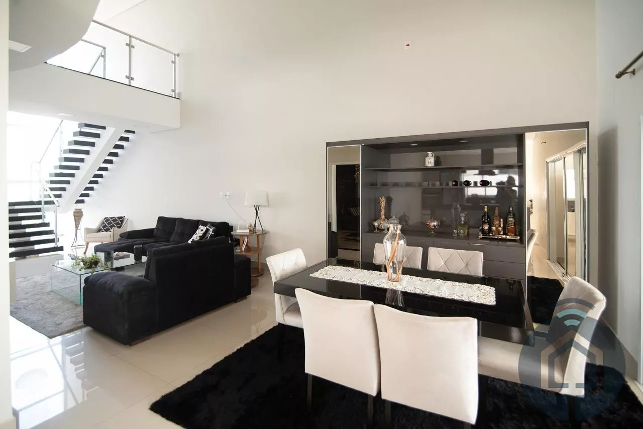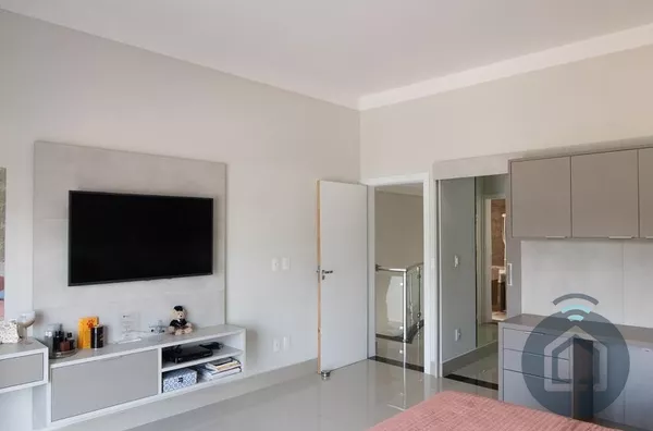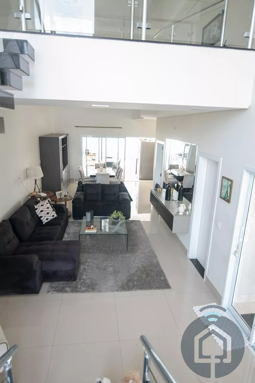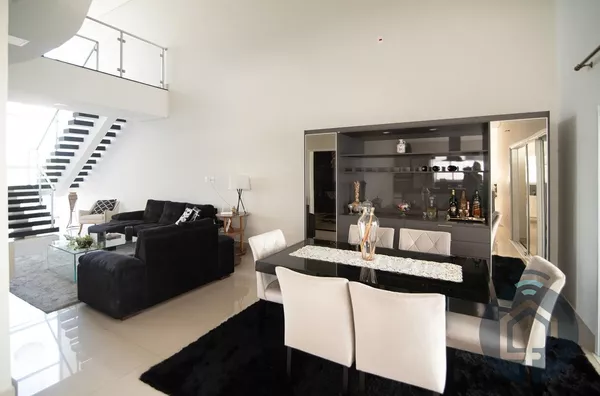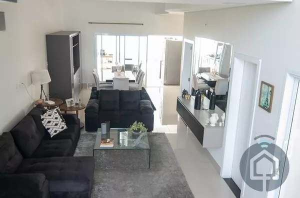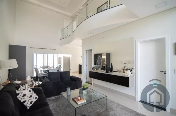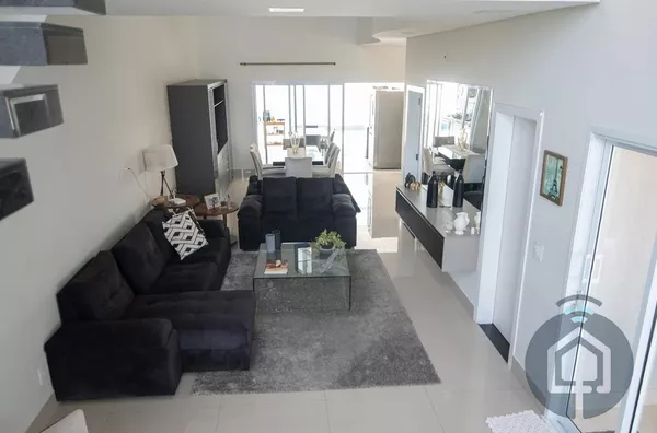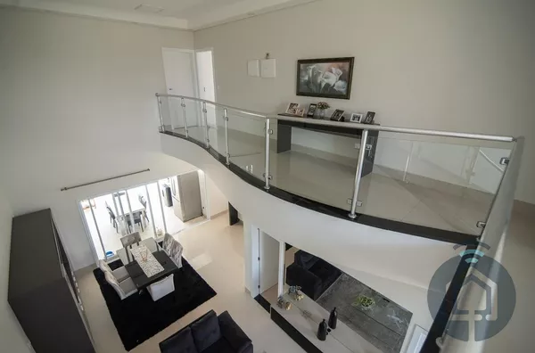 Casa moderna com 323,62 m² de área construída, possui três suítes, sendo a master com closet e hidromassagem, todas com varanda. Conta ainda com escritório, lavabo e uma ampla sala com pé direito duplo, integrando estar, jantar e TV.