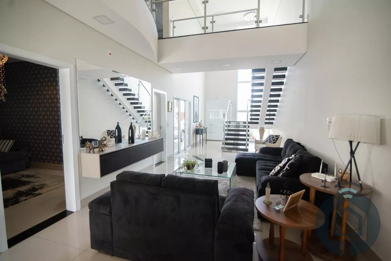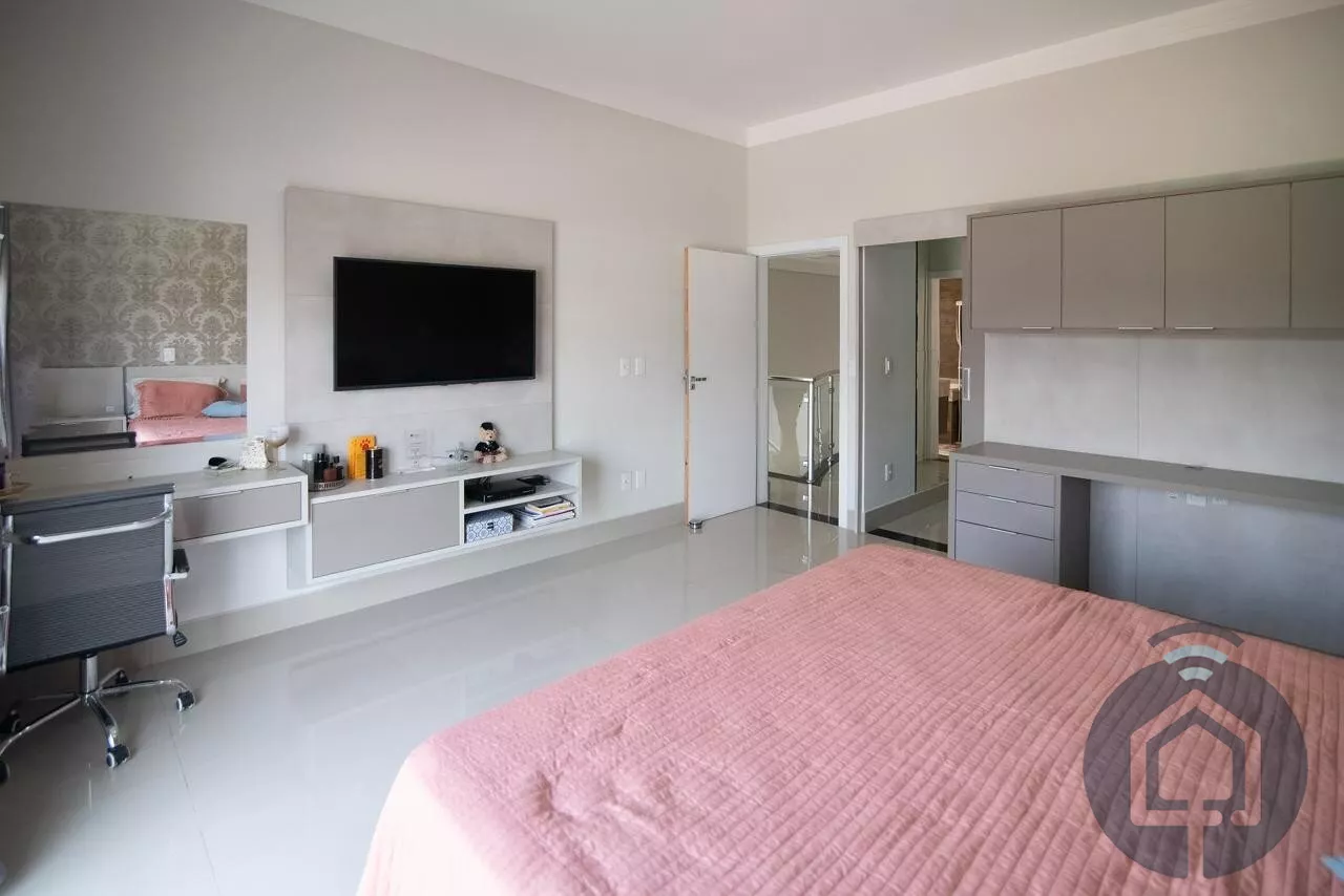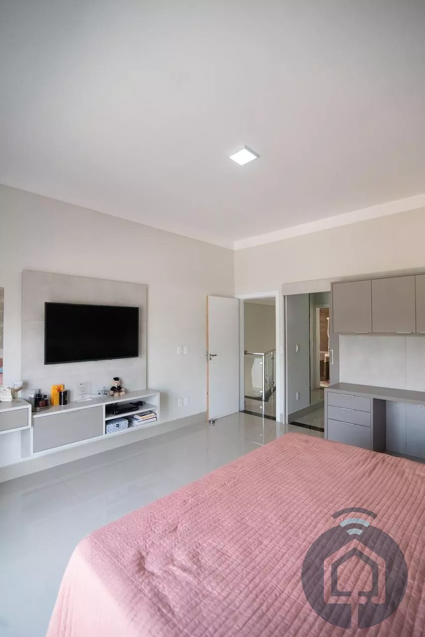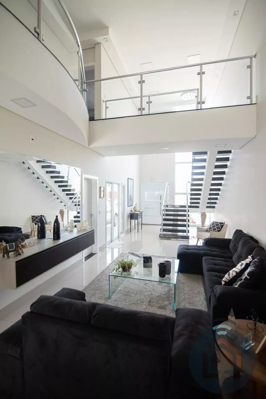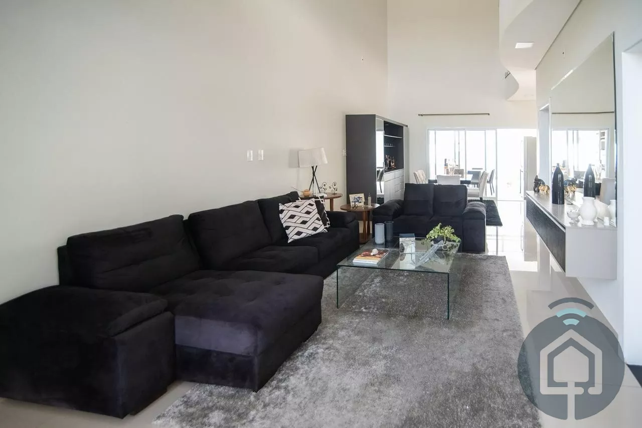 Casa moderna com 323,62 m² de área construída, possui três suítes, sendo a master com closet e hidromassagem, todas com varanda. Conta ainda com escritório, lavabo e uma ampla sala com pé direito duplo, integrando estar, jantar e TV.