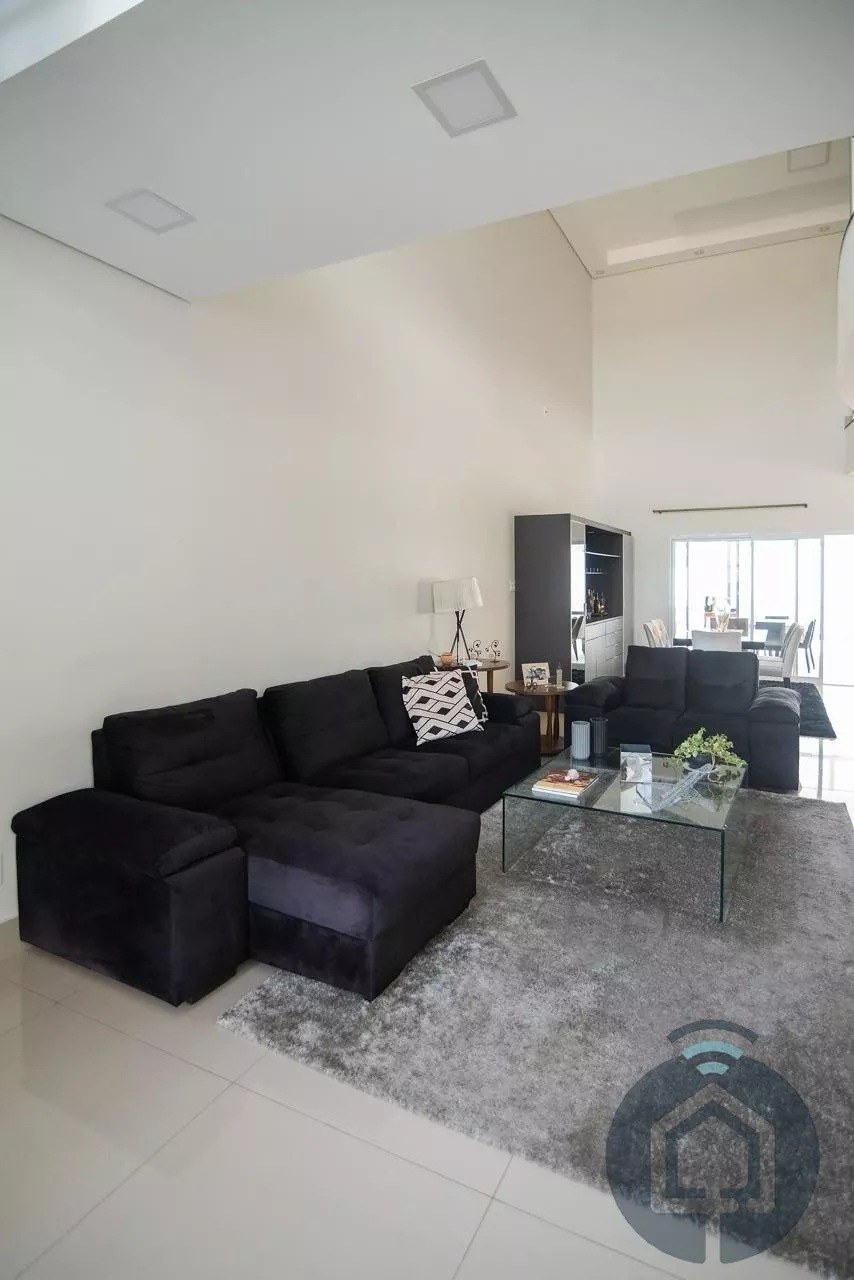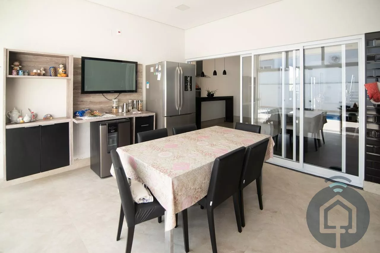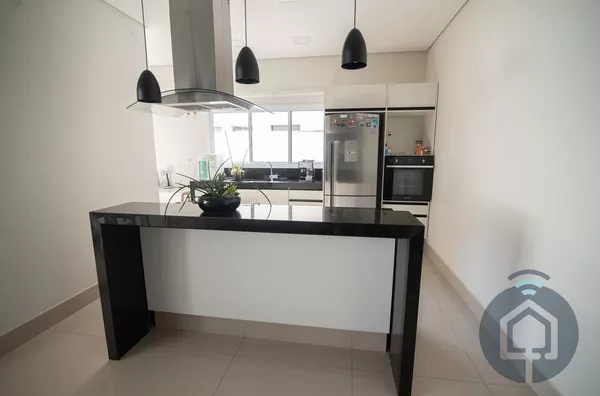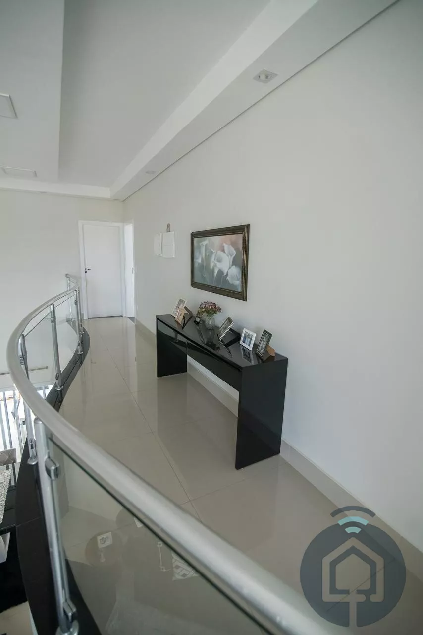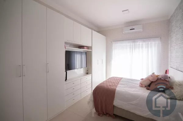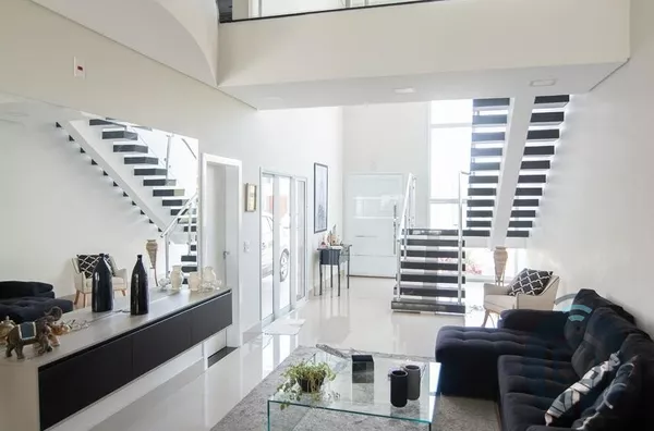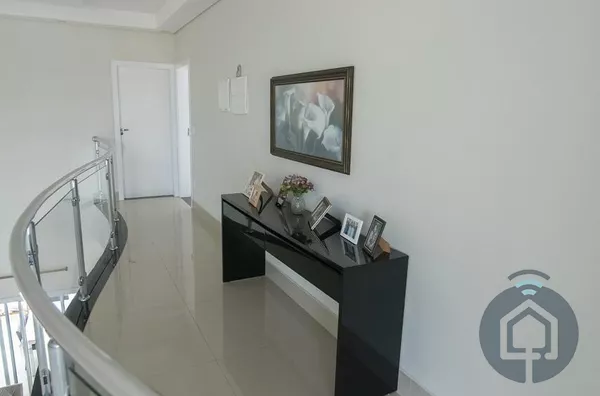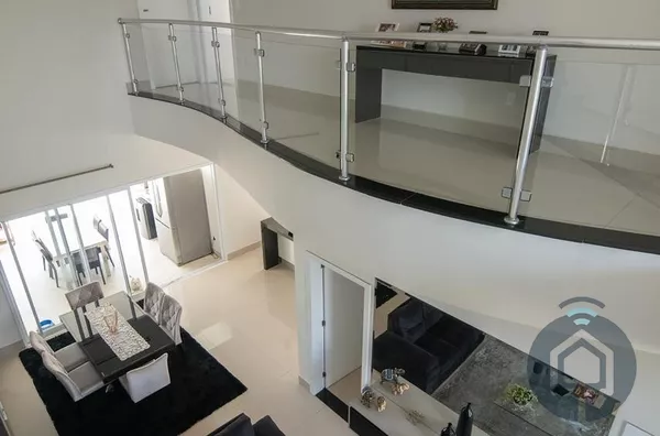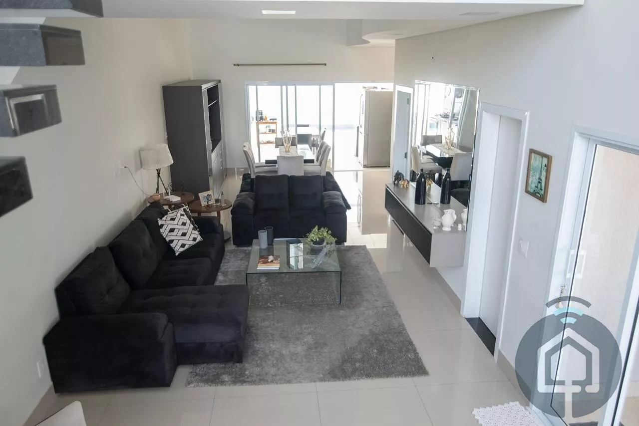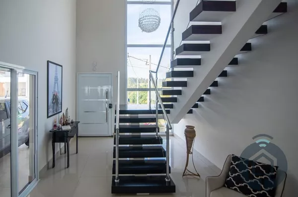 Casa moderna com 323,62 m² de área construída, possui três suítes, sendo a master com closet e hidromassagem, todas com varanda. Conta ainda com escritório, lavabo e uma ampla sala com pé direito duplo, integrando estar, jantar e TV.