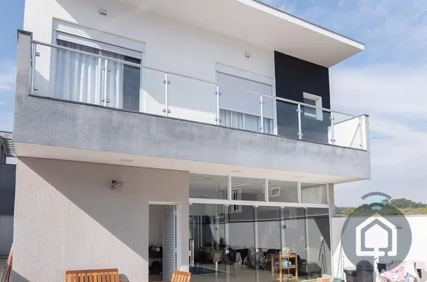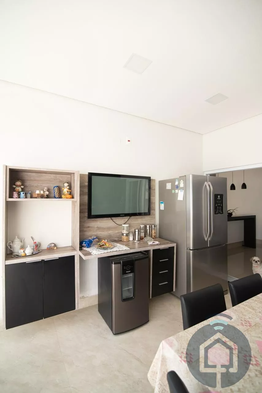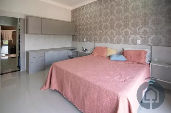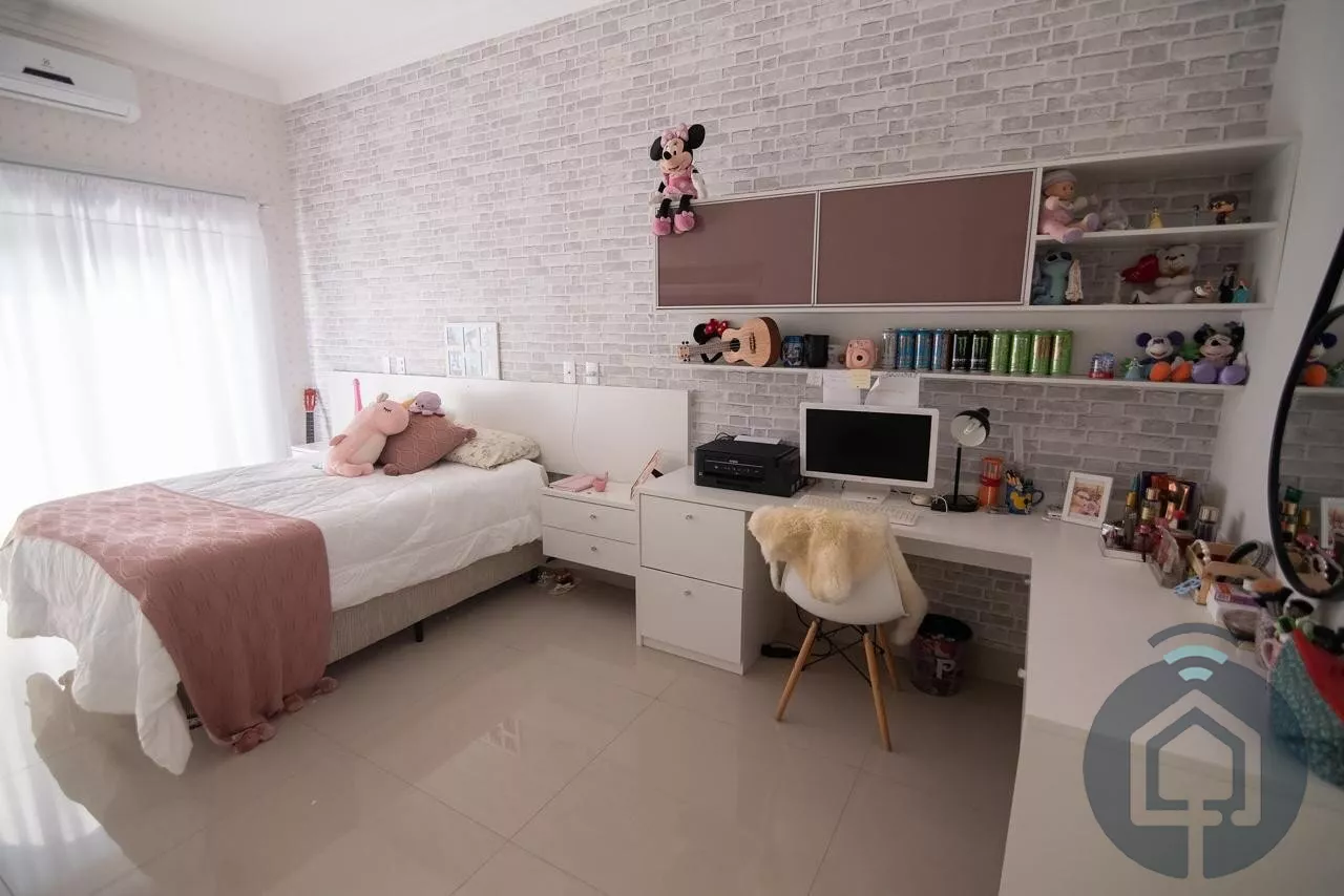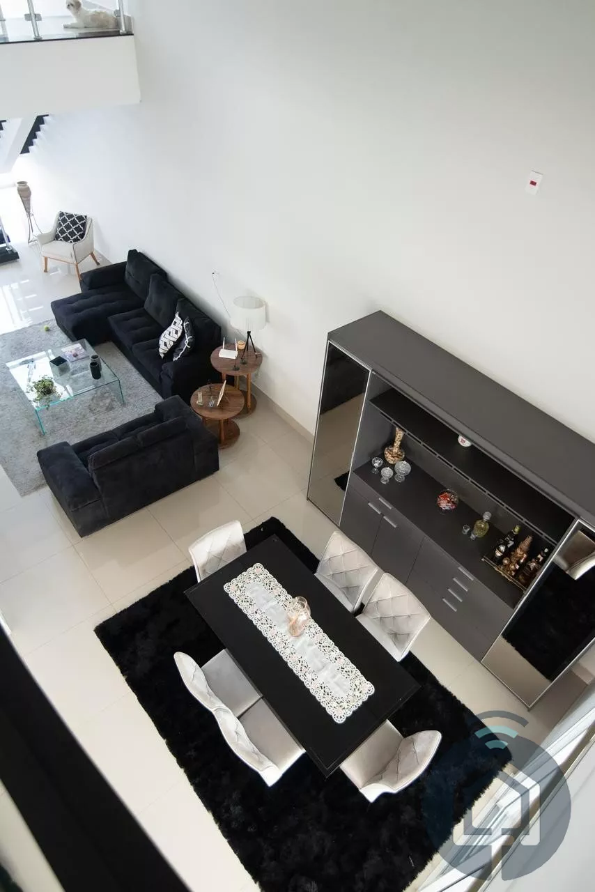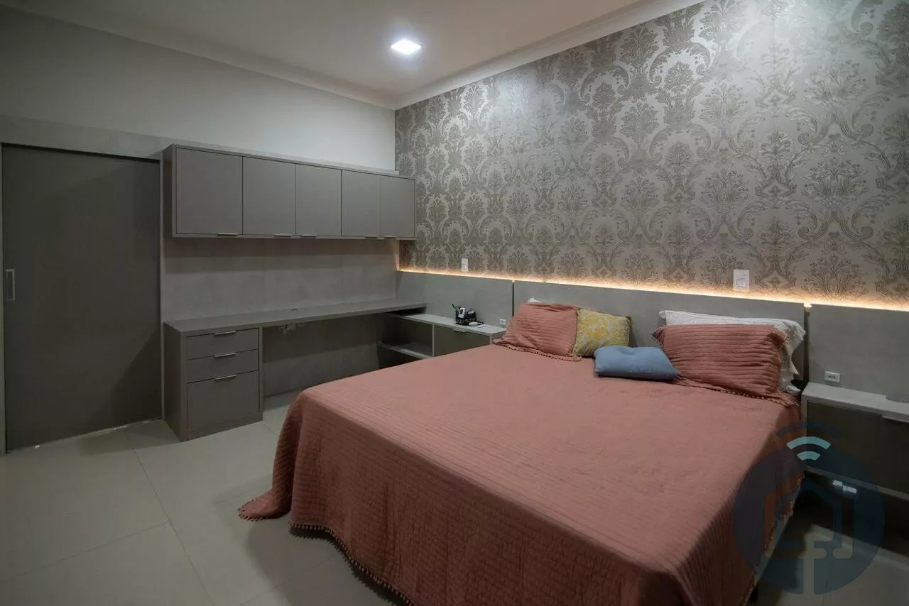 Casa moderna com 323,62 m² de área construída, possui três suítes, sendo a master com closet e hidromassagem, todas com varanda. Conta ainda com escritório, lavabo e uma ampla sala com pé direito duplo, integrando estar, jantar e TV.