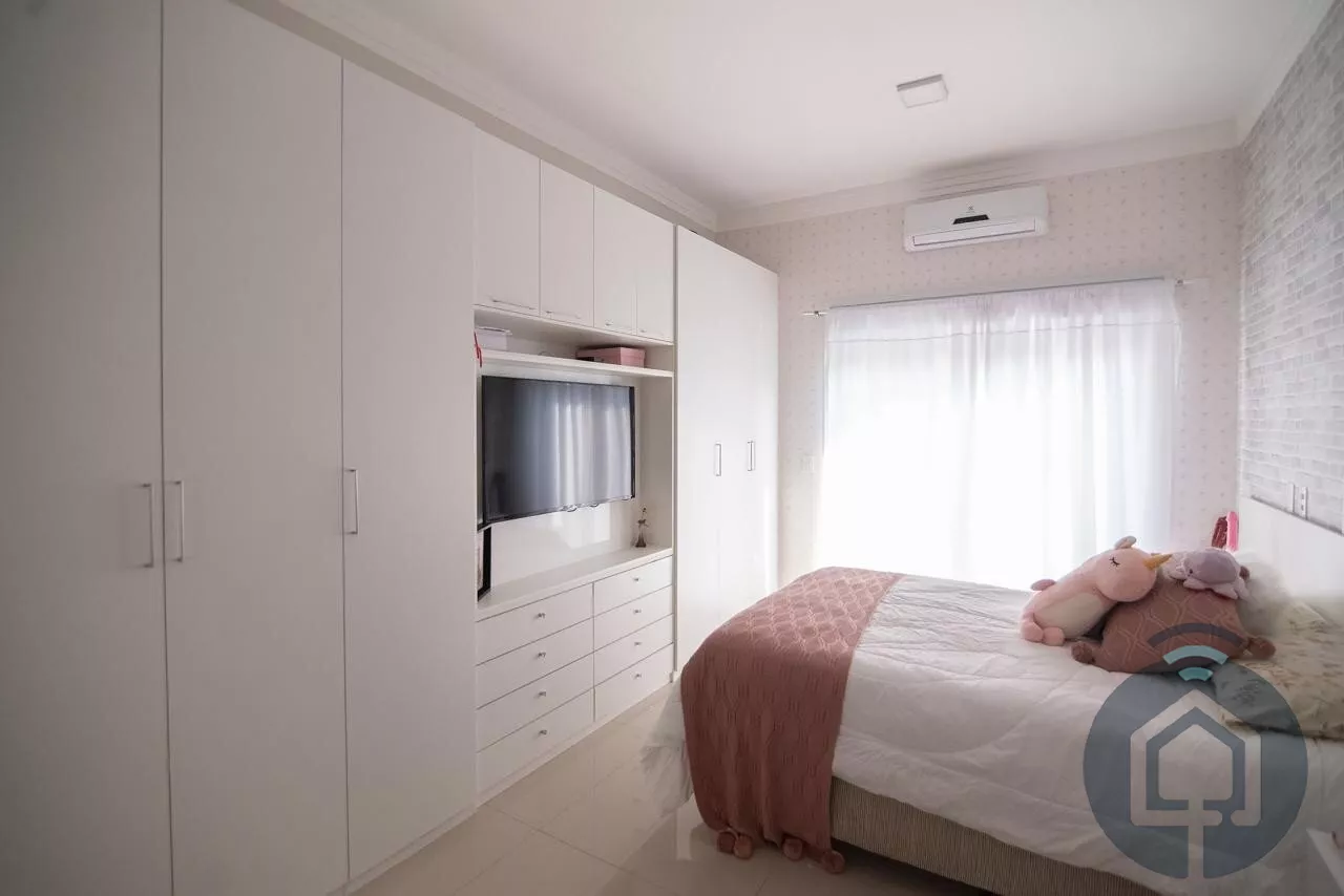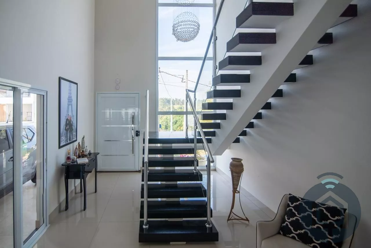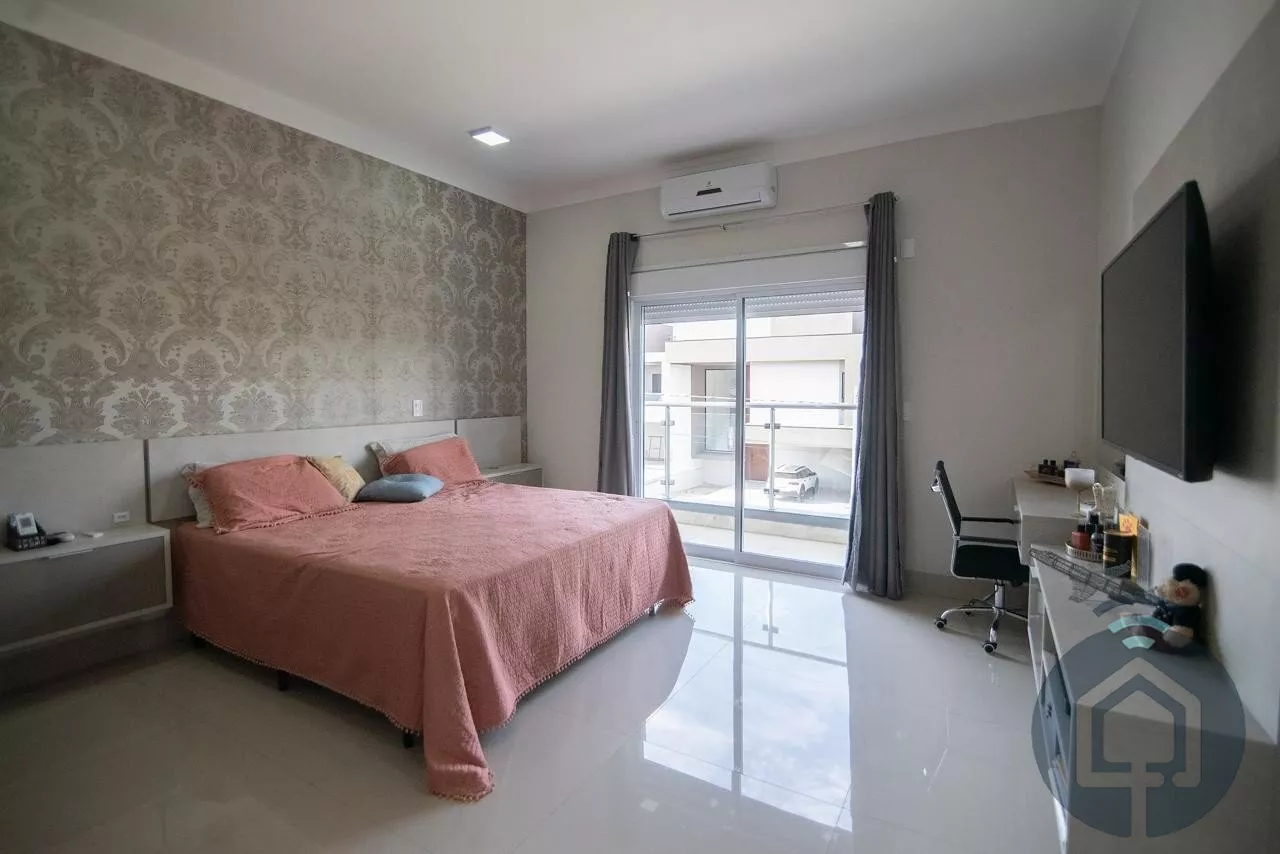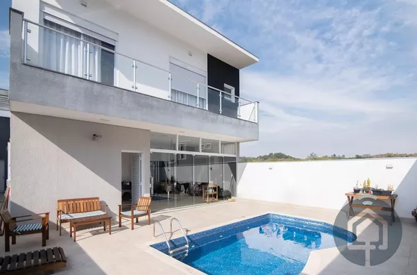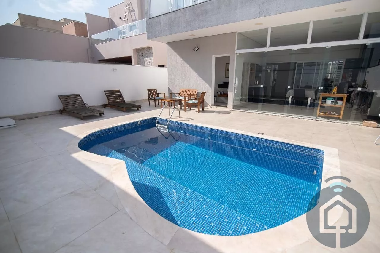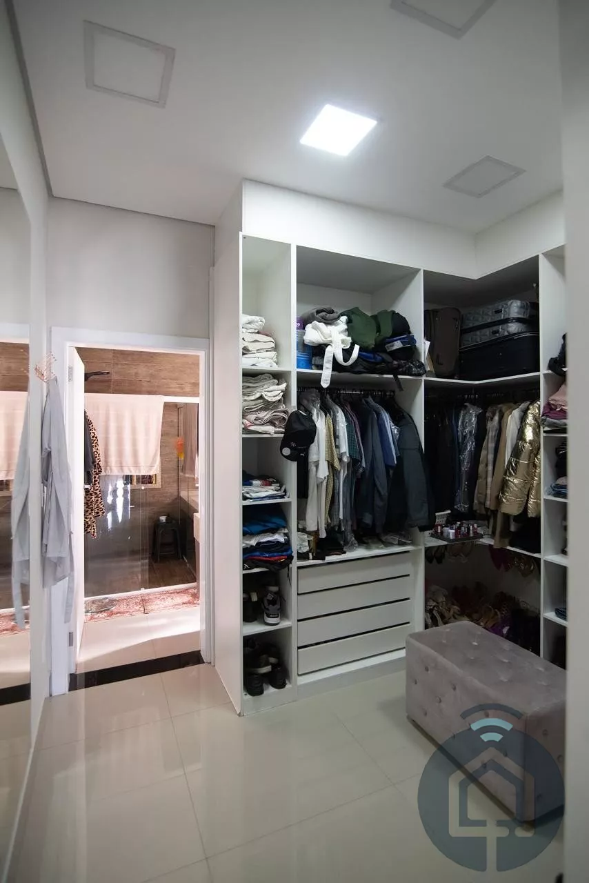 Casa moderna com 323,62 m² de área construída, possui três suítes, sendo a master com closet e hidromassagem, todas com varanda. Conta ainda com escritório, lavabo e uma ampla sala com pé direito duplo, integrando estar, jantar e TV.