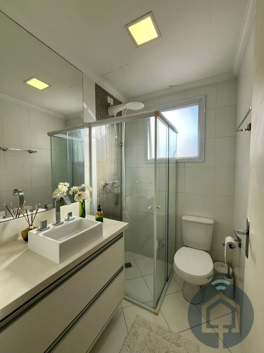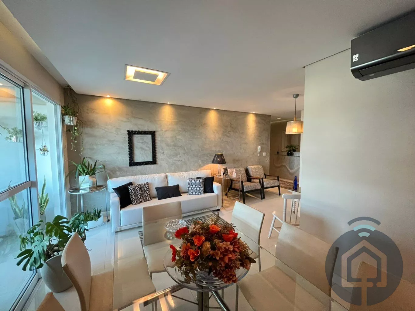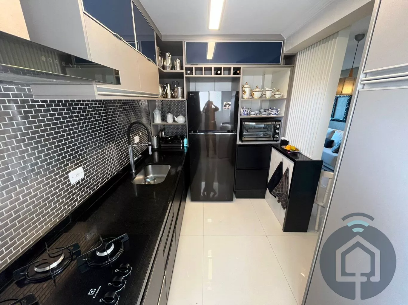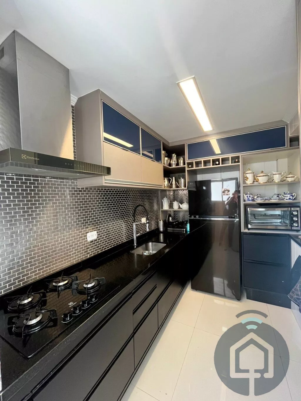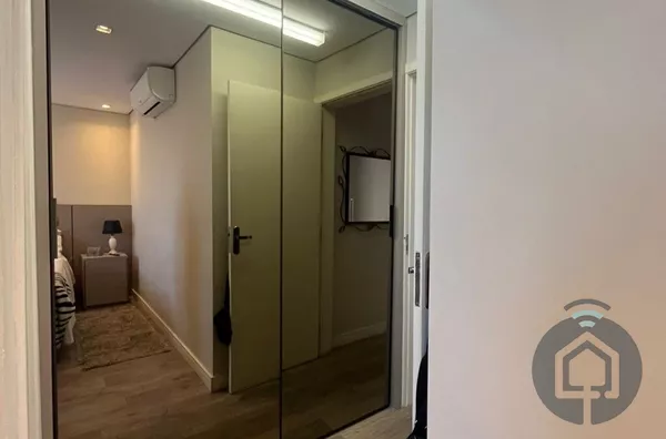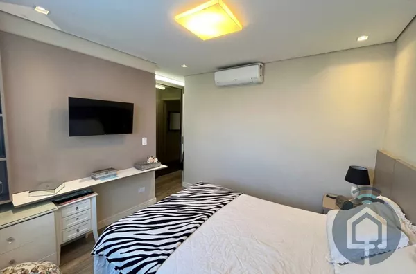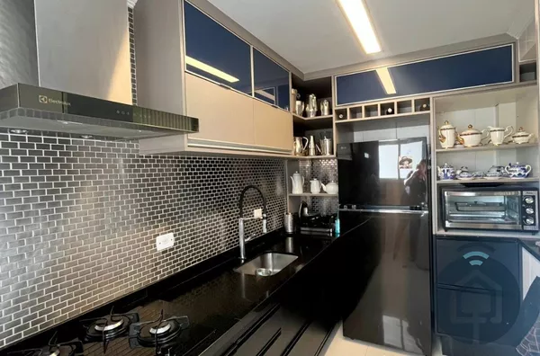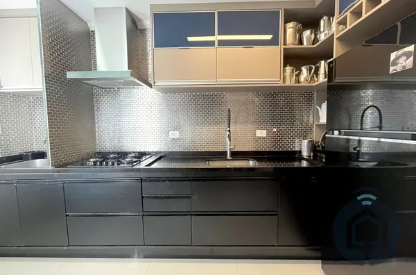 A cozinha planejada é moderna e integrada à lavanderia. Conta ainda com lavabo, ar-condicionado, aquecedor a gás, acabamento de alto padrão e 2 vagas cobertas.