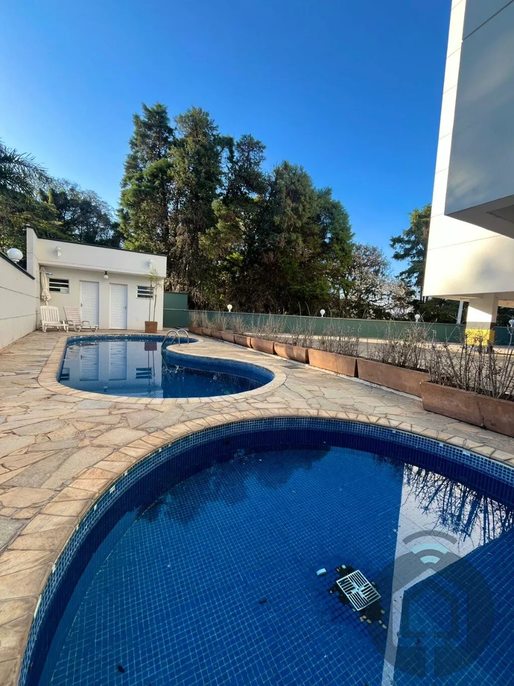 O condomínio oferece portaria remota 24h, piscinas, academia, brinquedoteca e churrasqueira coletiva.