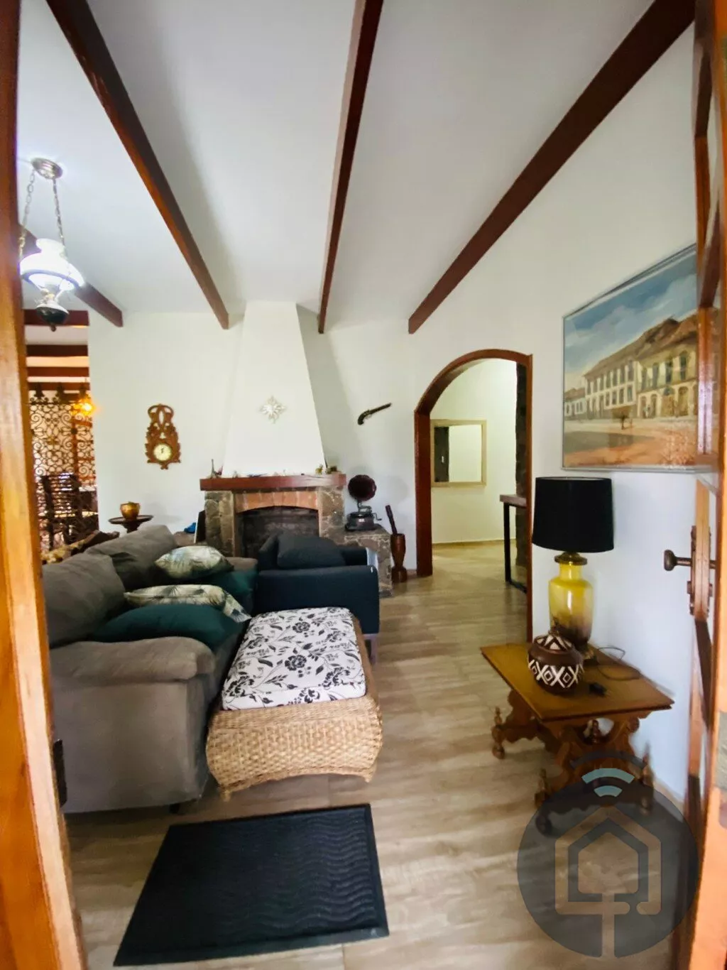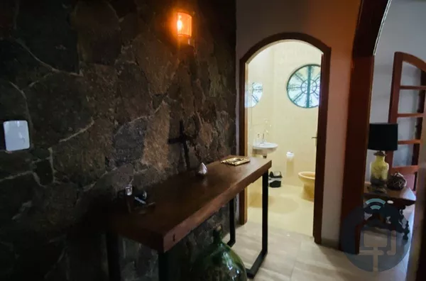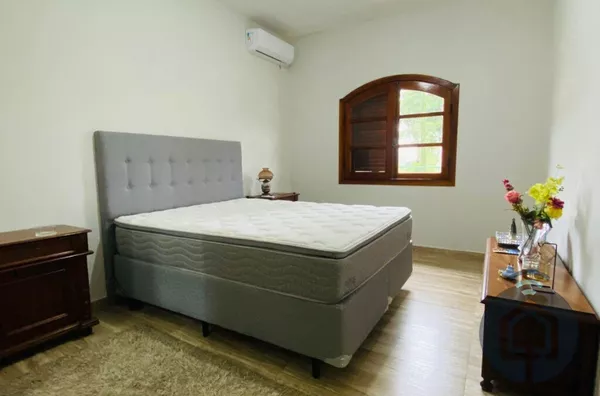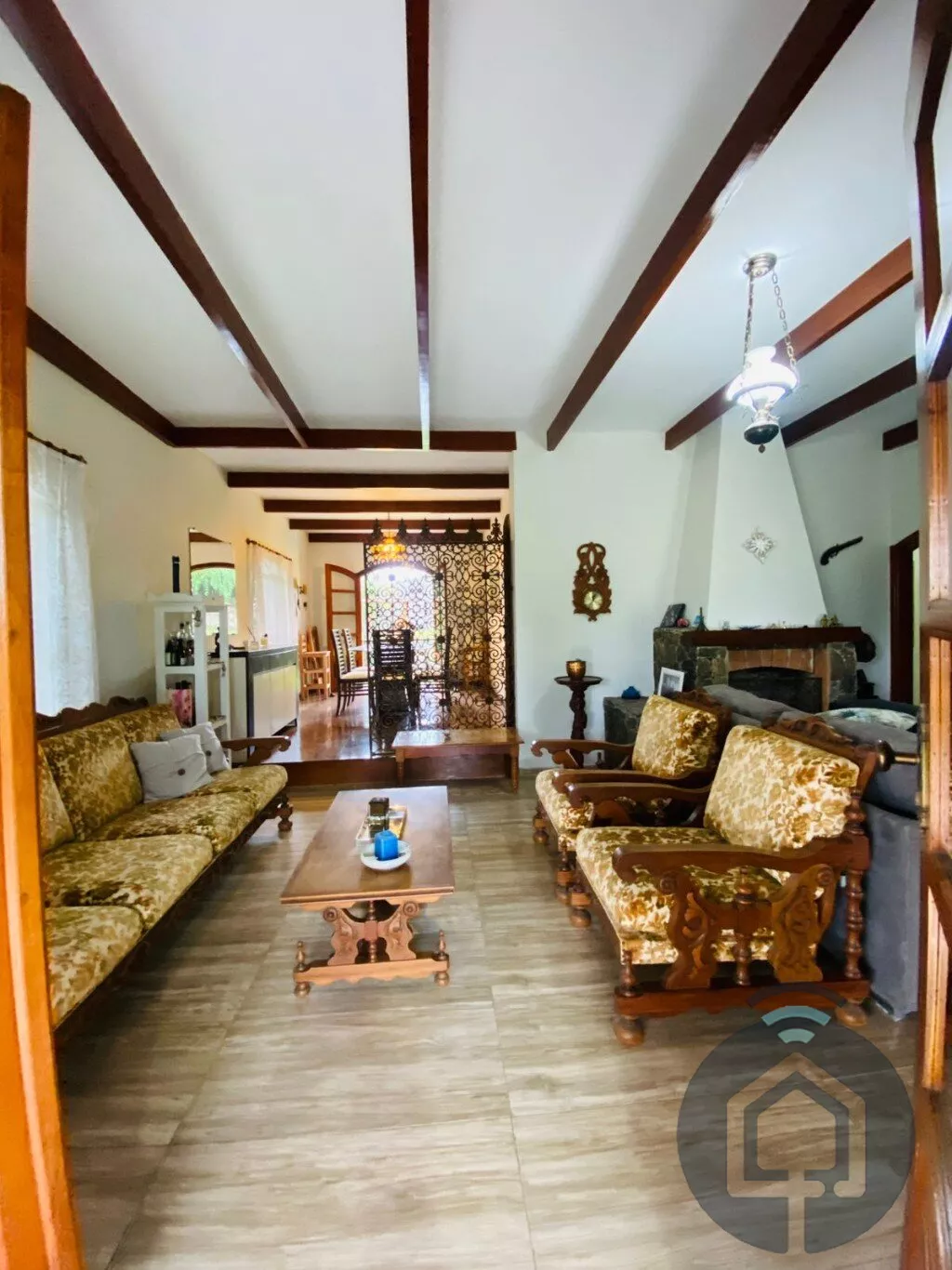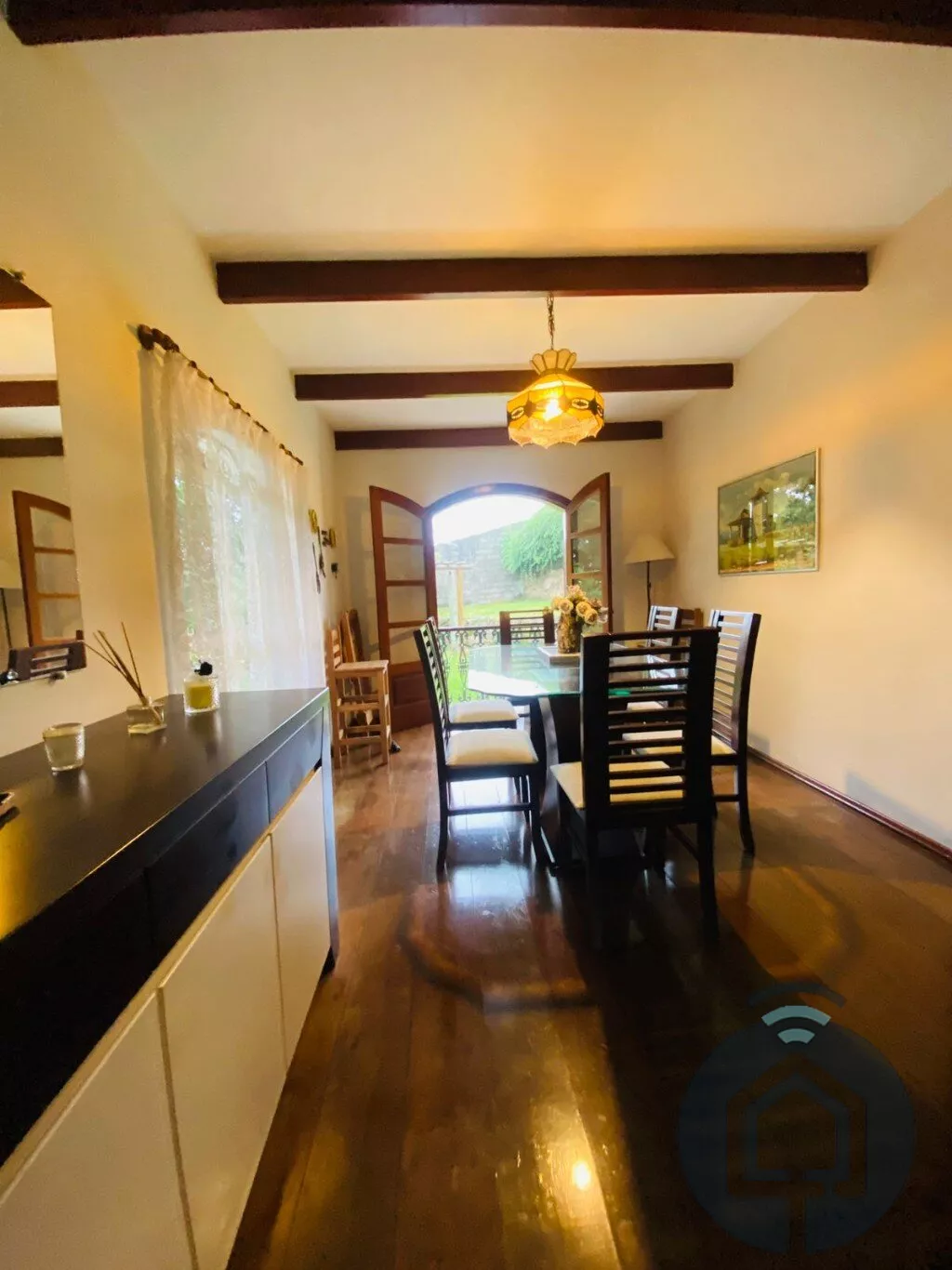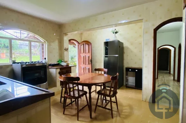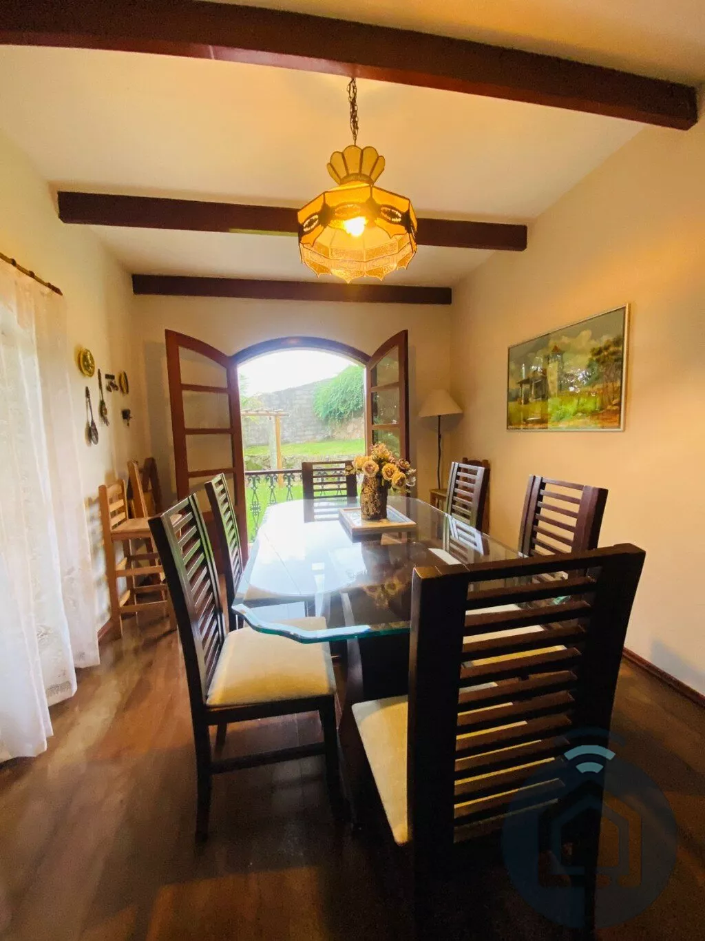 A casa principal, térrea, foi pensada para proporcionar conforto, luminosidade natural e integração com o verde ao redor. Ela conta com três dormitórios com armários embutidos, sendo uma suíte com closet, além de dois banheiros sociais e um lavabo. A área social é acolhedora e perfeita para receber, com sala de jantar, sala de estar com dois ambientes e lareira, criando um ambiente charmoso para os dias mais frios. A cozinha com armários planejados oferece praticidade no dia a dia.