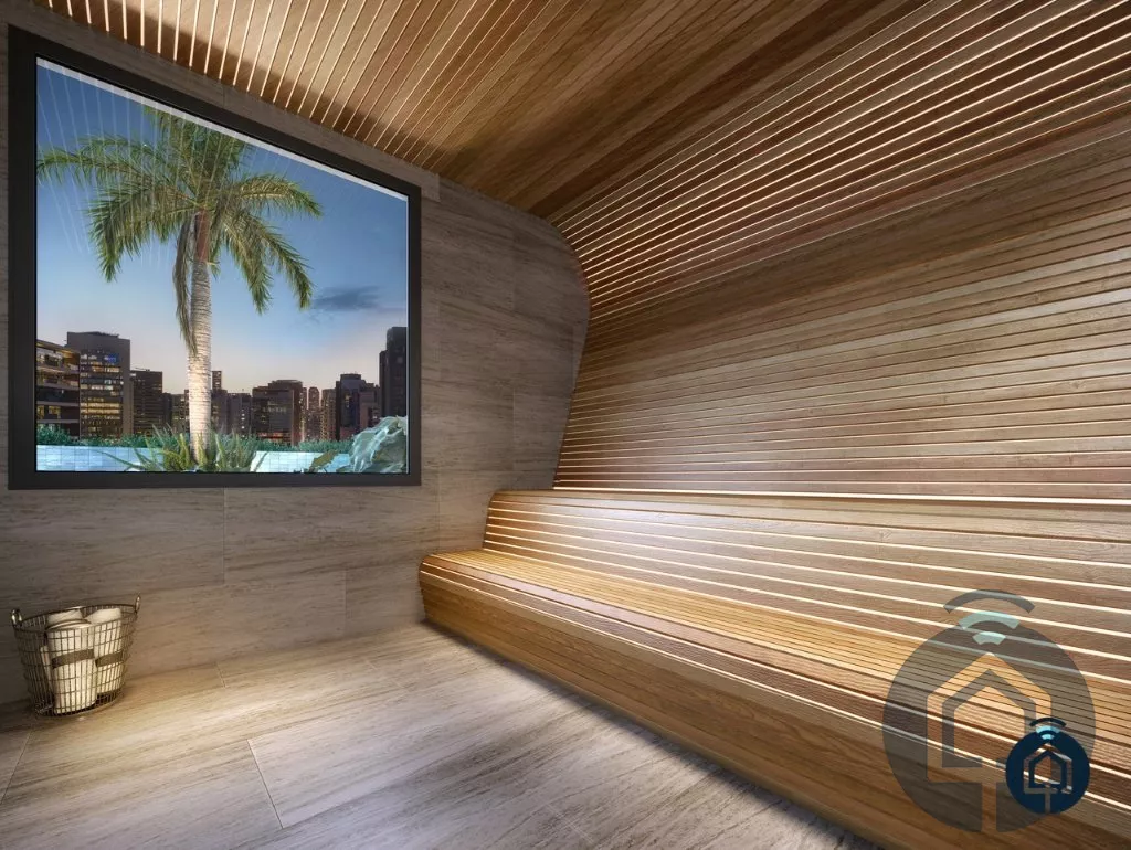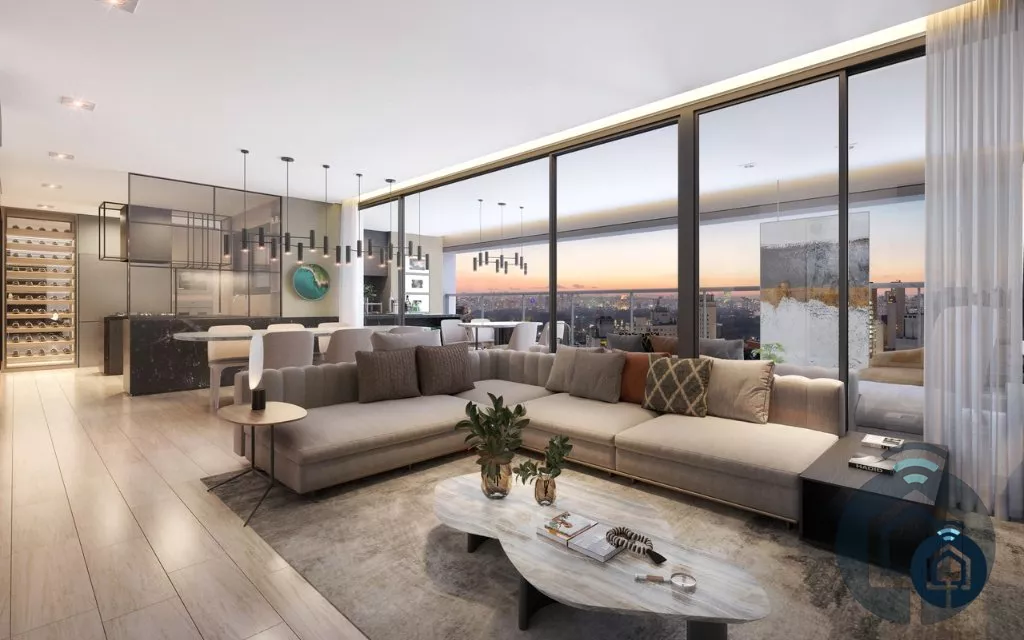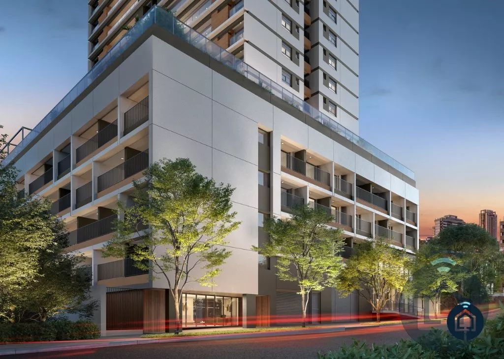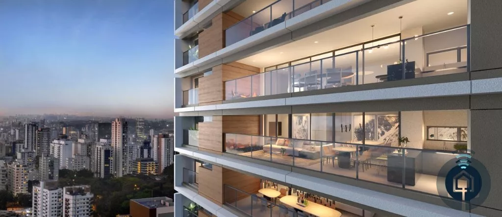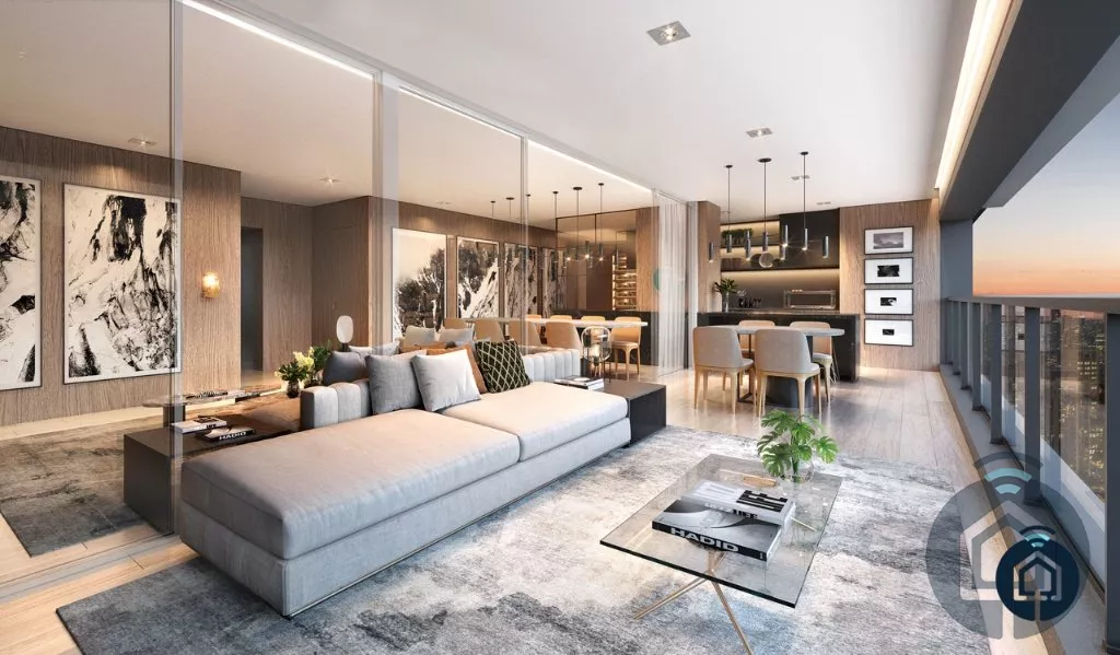 Apartamentos com 4 dormitórios, sendo 1 suíte com closet e 1 suíte simples, 1 banheiro social, sala de estar dois ambientes, varanda gourmet ampla, lavabo, cozinha, área de serviços, banheiro de serviço e 2 vagas de garagem. O condomínio conta com área de lazer completa com salão de festas com terraço, espaço gourmet, churrasqueira com forno de pizza, piscina adulto, deck molhado, piscina infantil, solário, sauna, sala de massagem, espaço fitness, terraço fitness, terraço boxe, quadra recreativa, salão de jogos, brinquedoteca, playground, bangalôs e jardins com espelho d'água. Além disso possui portaria, delivery space, acesso para pedestres e acesso de serviços.