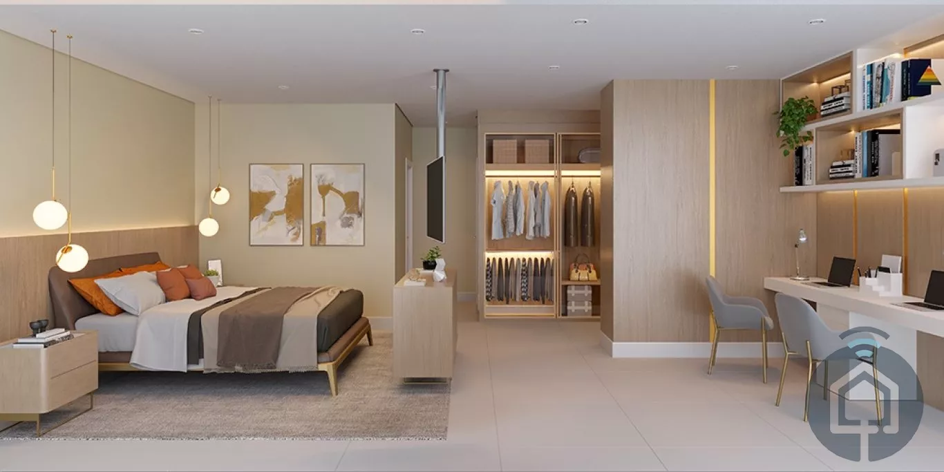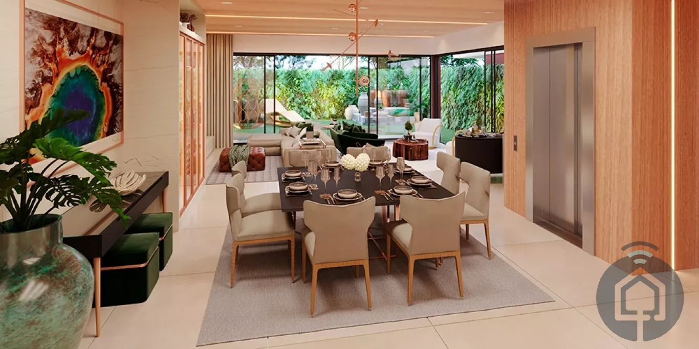 Casa de alto padrão em condomínio fechado, com área privativa de 548 m², com 4 pavimentos, elevador, infraestrutura para automação residencial e para placas de energia solar. O imóvel conta com 3 suítes avarandadas, sendo 1 suíte máster com amplo closet e banho com duas cubas e hidromassagem, sala de estar ampla com vista para o jardim, lavabo, sala de jantar integrada, cozinha com iluminação e ventilação natural, despensa, área de serviço, área ventilada para secagem de roupas, dependência de colaboradores e banheiro, acesso social interligado com delivery, espaço delivery, jardim privativo, exclusivo rooftop gourmet, infraestrutura para bancada e churrasqueira, banheiro, piscina climatizada com borda infinita e 4 vagas de garagem cobertas. O condomínio conta com portaria blindada, clausura de entrada de pedestres e automóveis, gerador em áreas privativas e comuns, projeto de segurança, água de reuso e espaço fitness by Cia Athletica.