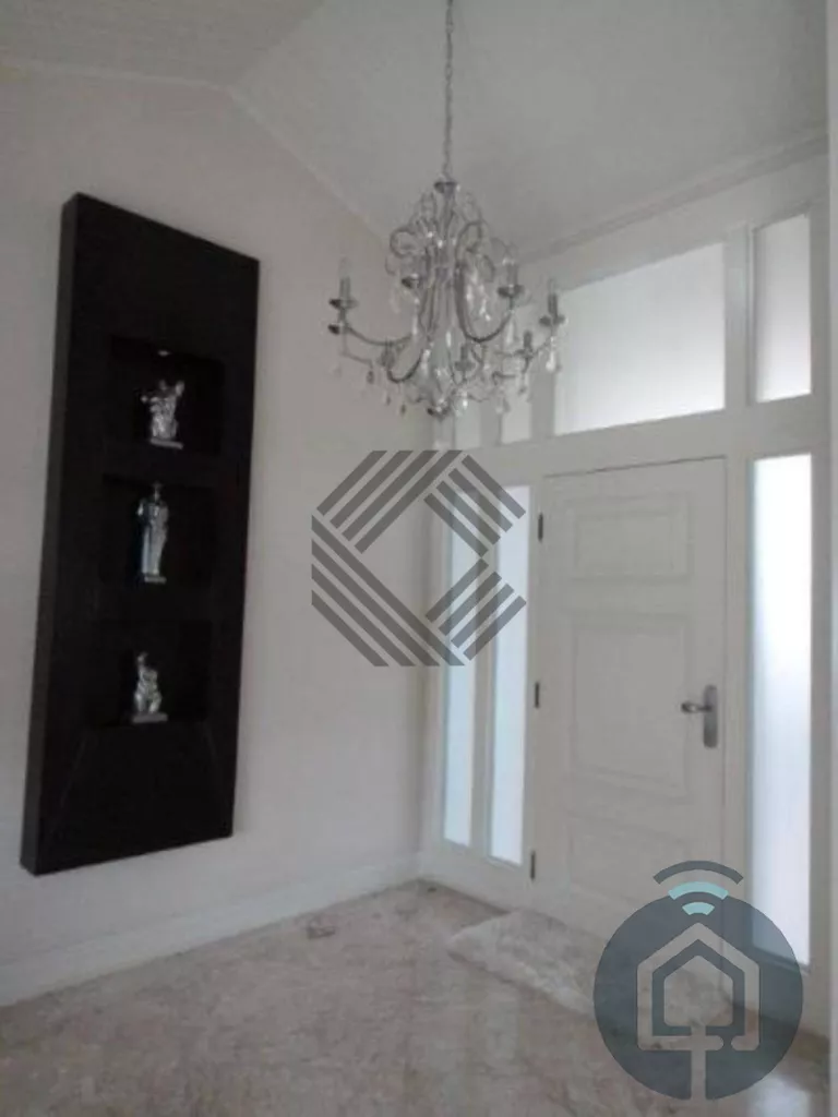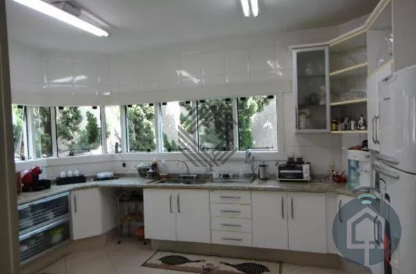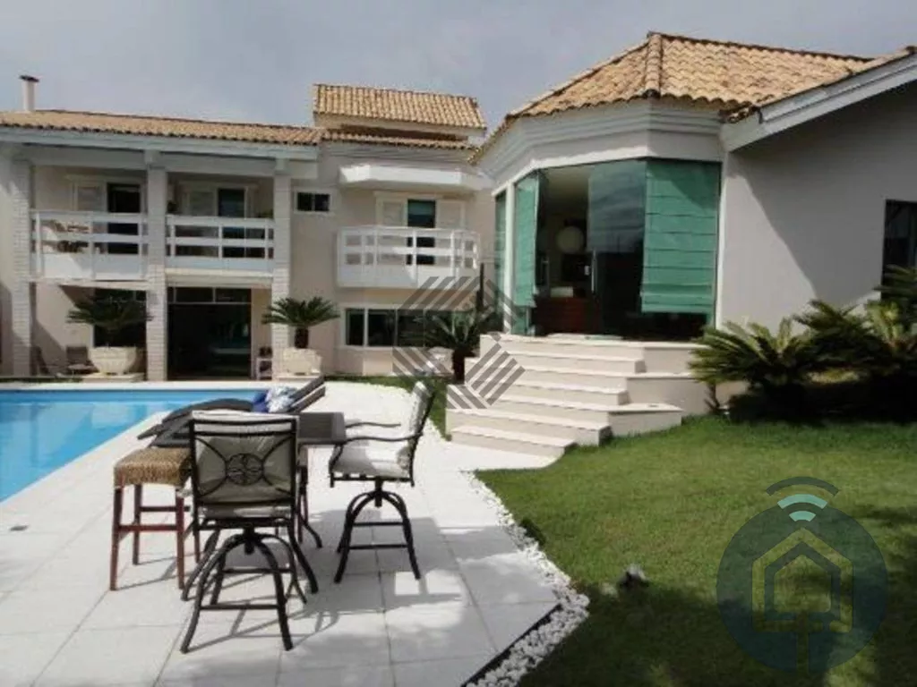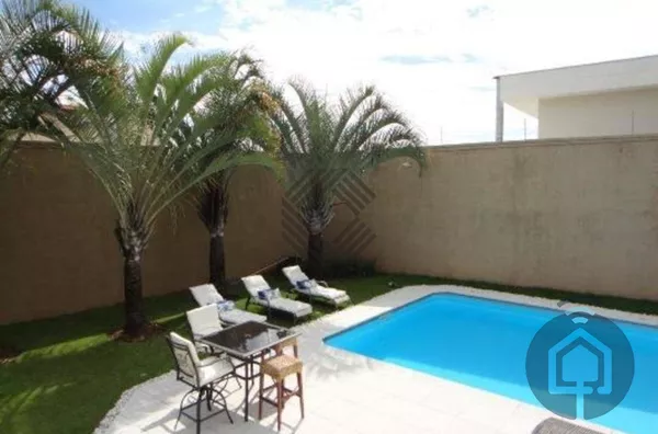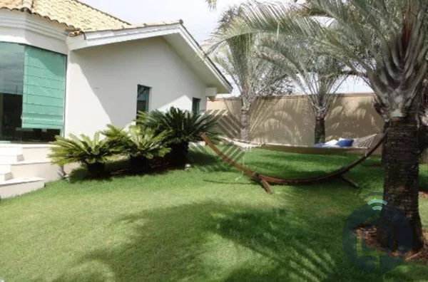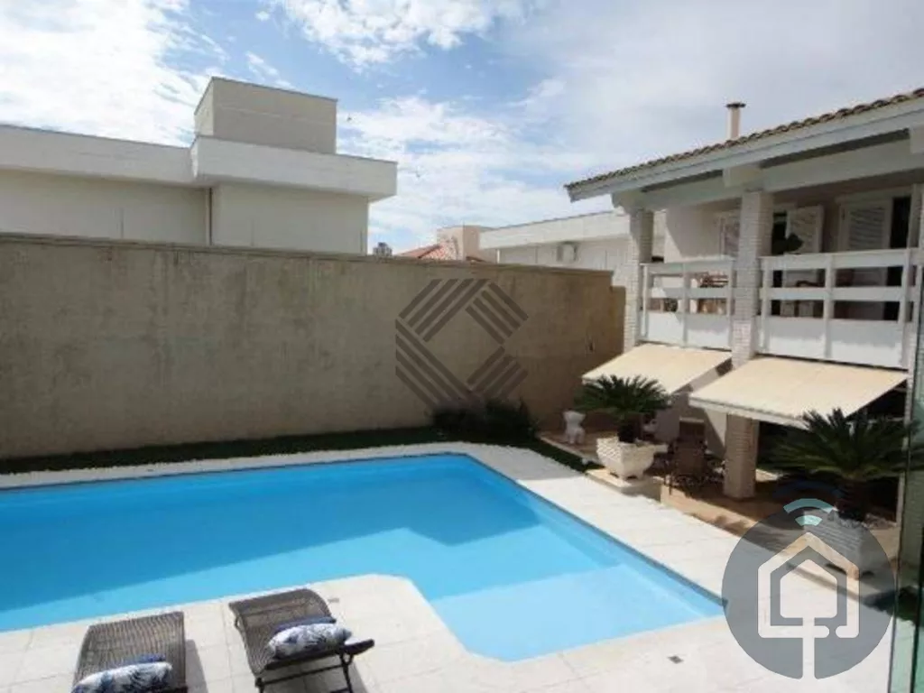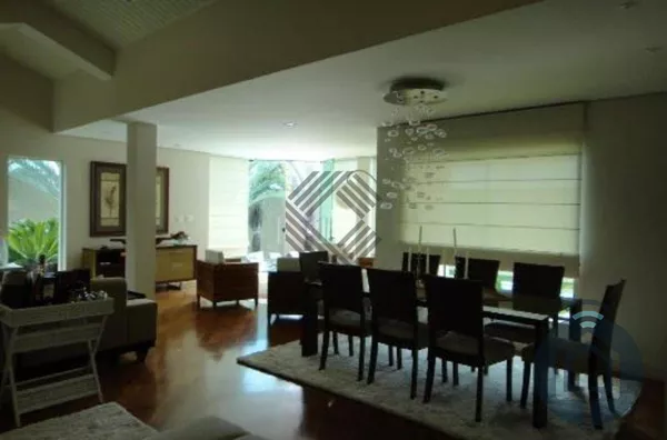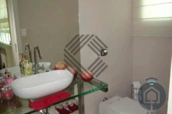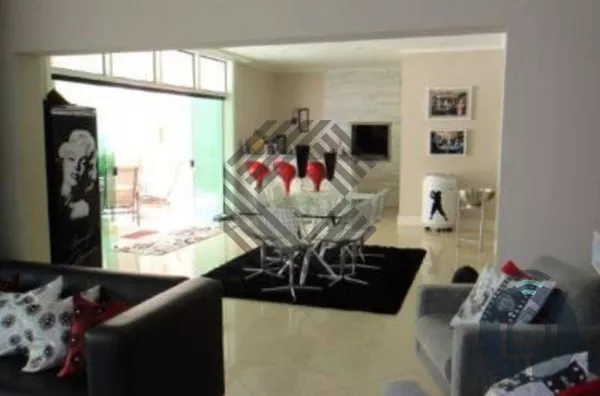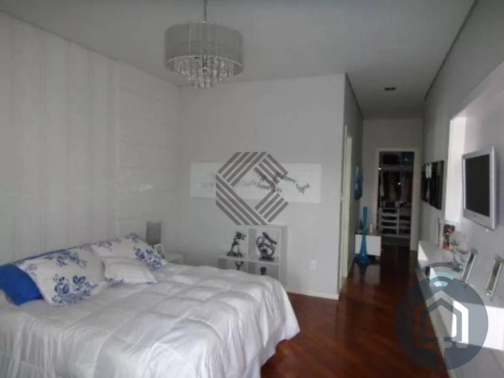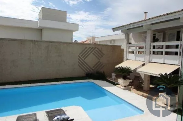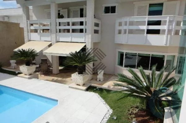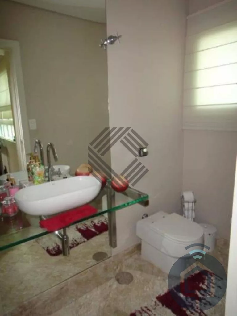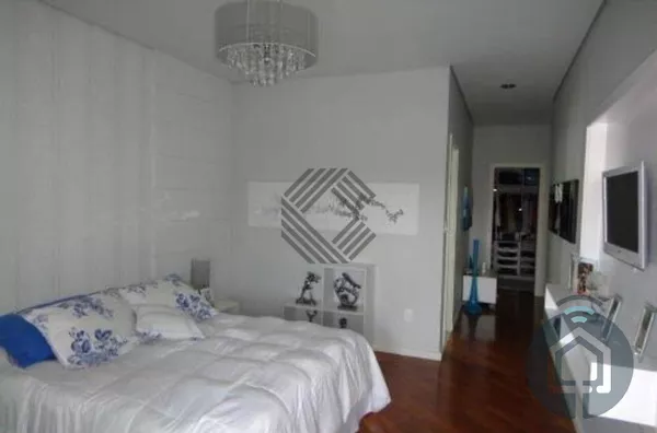 Sobrado de alto padrão, com excelente acabamento, localizado em condomínio fechado. O imóvel conta com 4 suítes avarandadas com closet planejado, sendo 1 máster com banheira de hidromassagem, hall de entrada todo em mármore travertino, sala de estar, sala de tv e living com lareira integrados, lavabo em mármore travertino, copa, cozinha planejada, despensa e lavanderia com armários modulados, dependência de empregados, área de secagem de roupas, área gourmet em granito e mármore branco, churrasqueira, cozinha de apoio com armários planejados, despensa, adega, piscina com piso castellato, quintal gramado, banheiro externo de apoio e garagem para 7 carros, sendo 4 vagas cobertas.
