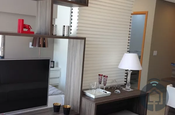 Excelente studio com varanda, acabamento de alto padrão, 1 dormitório, banheiro social, sala de estar, cozinha integrada e 1 vaga de garagem.