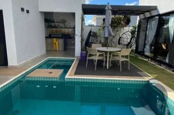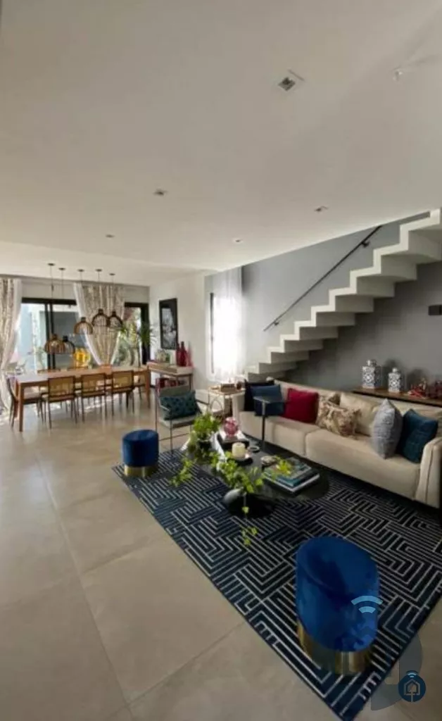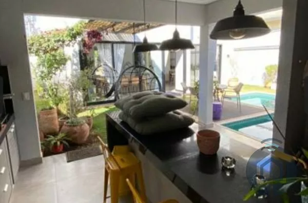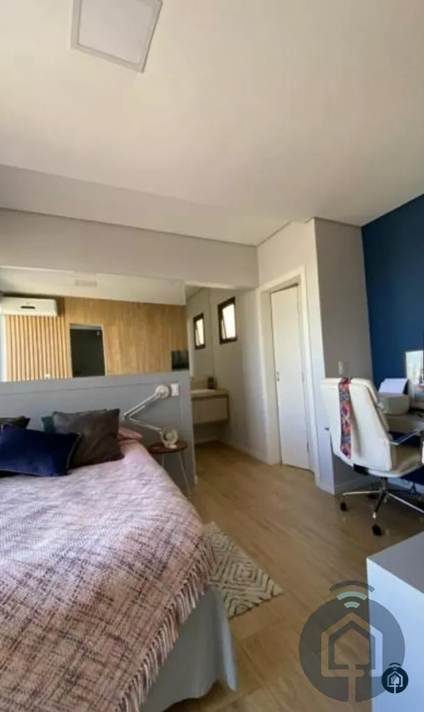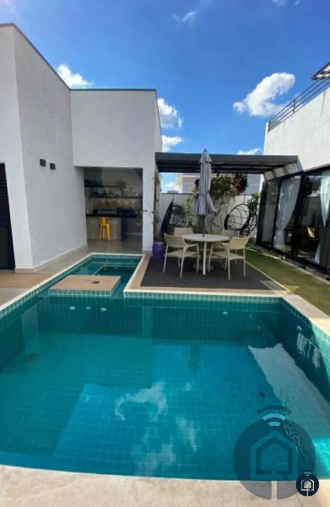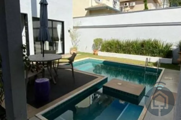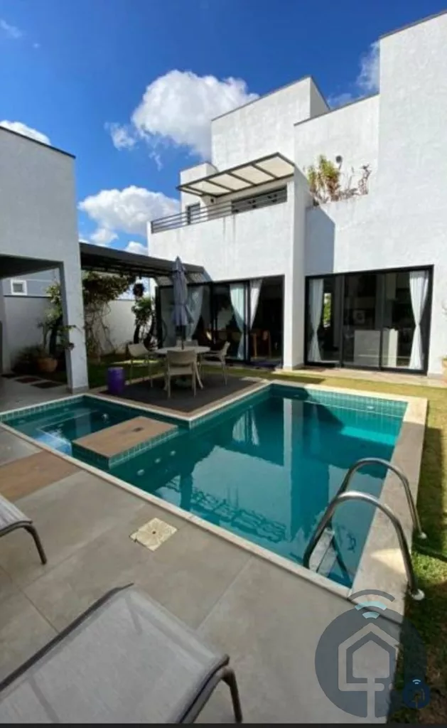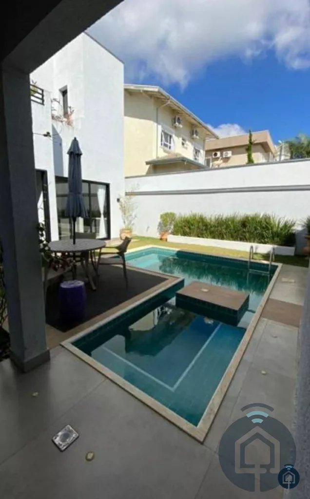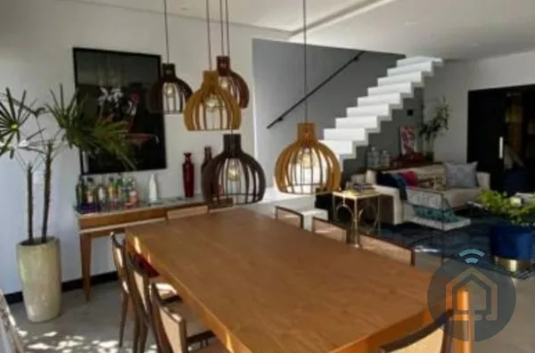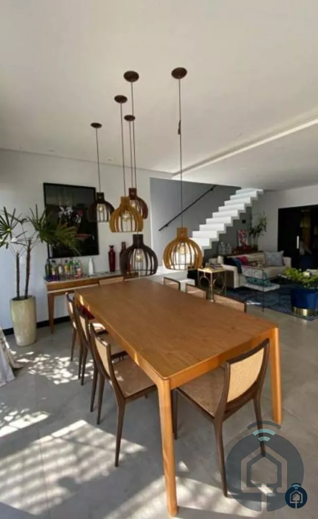Aconchegante sobrado em condomínio, 3 suítes com ar condicionado, sendo 1 suíte máster com hidromassagem e 2 suítes com closet e varanda, ampla sala de estar, lavabo, sala de tv, sala íntima com ar condicionado, sala de jantar, cozinha planejada com ilha, cooktop, coifa e forno elétrico, lavanderia, área gourmet planejada com churrasqueira, banheiro externo, piscina aquecida, jardim, sistema de aquecimento solar e garagem para 4 automóveis, sendo 2 cobertas.
