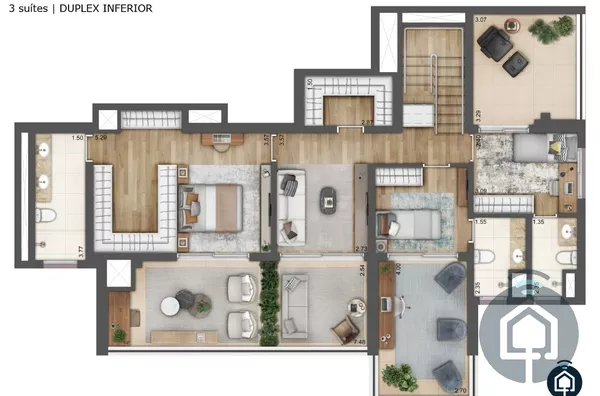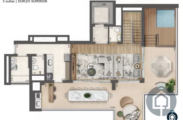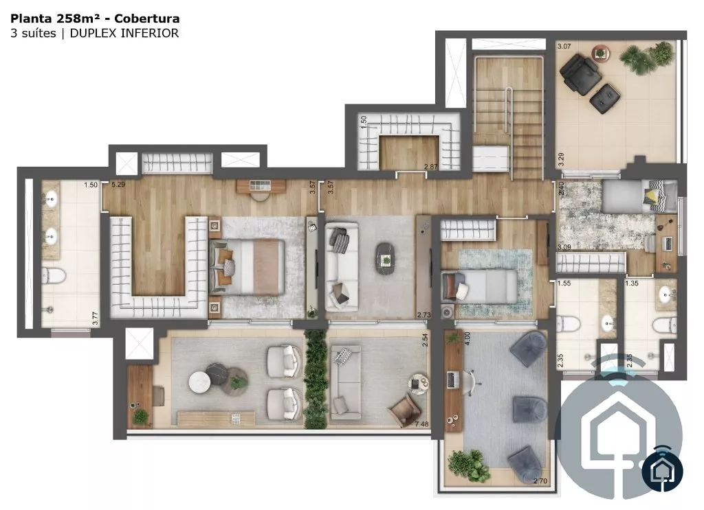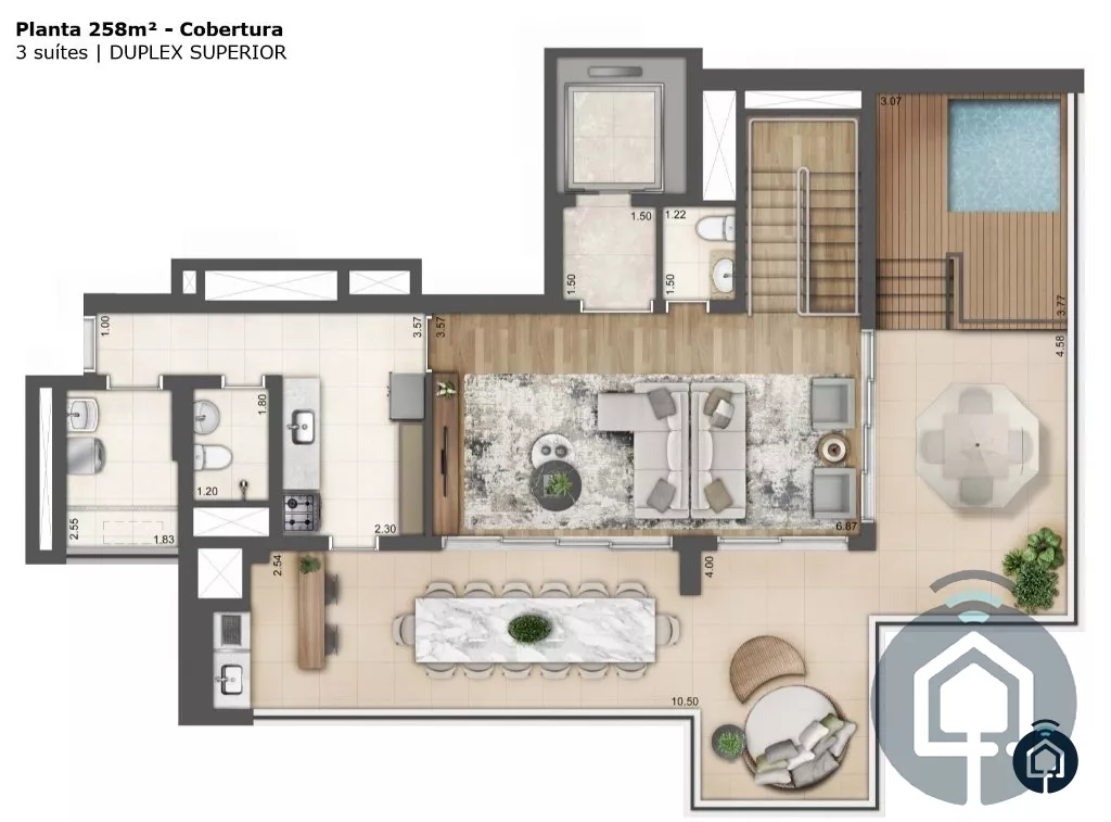 Apartamento com ambientes amplos e integrados, ventilação natural, varanda gourmet e infraestrutura para ar condicionado. Exclusivo duplex com 3 suítes avarandadas, sendo 1 suíte máster e sala de estar na parte inferior, amplo living, varanda gourmet, cozinha, área de serviço com banheiro e 2 vagas de garagem. Lazer completo para todas as idades: Salão de festas, área gourmet, churrasqueira, piscina com raia de 25 metros, piscina coberta e aquecida, sauna, lounge com lareira fitness, quadra poliesportiva, espaço co-working, brinquedoteca e muito mais.